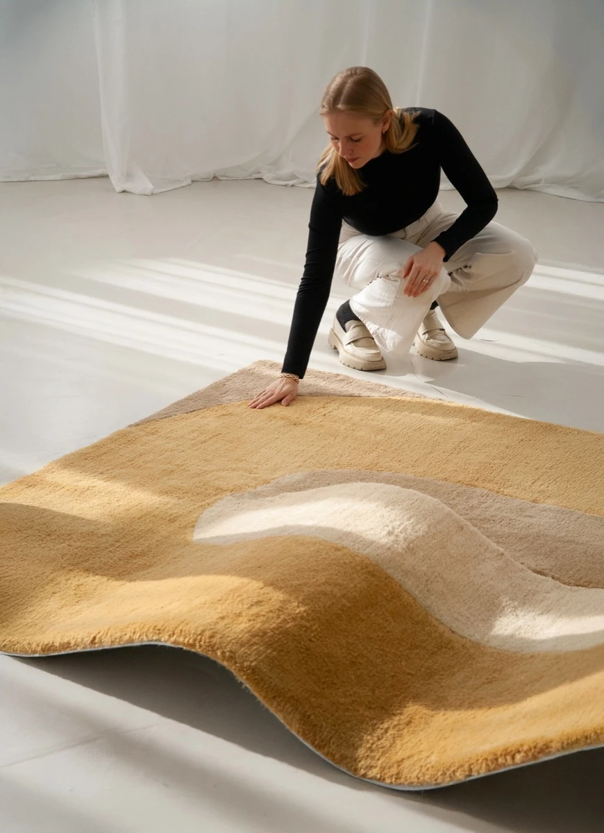 Tejida en lana merino tufted y confeccionada en Colonia por Nando Studio, Dune también se destaca por su textura suave y envolvente.