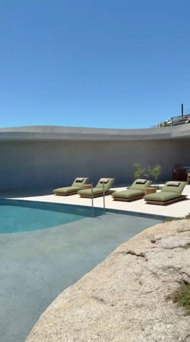 En particular, dedica un elogio a una mesa baja de exteriores junto a la pileta –100 % brutalista- diseñada en base a una inmensa piedra natural del terreno.