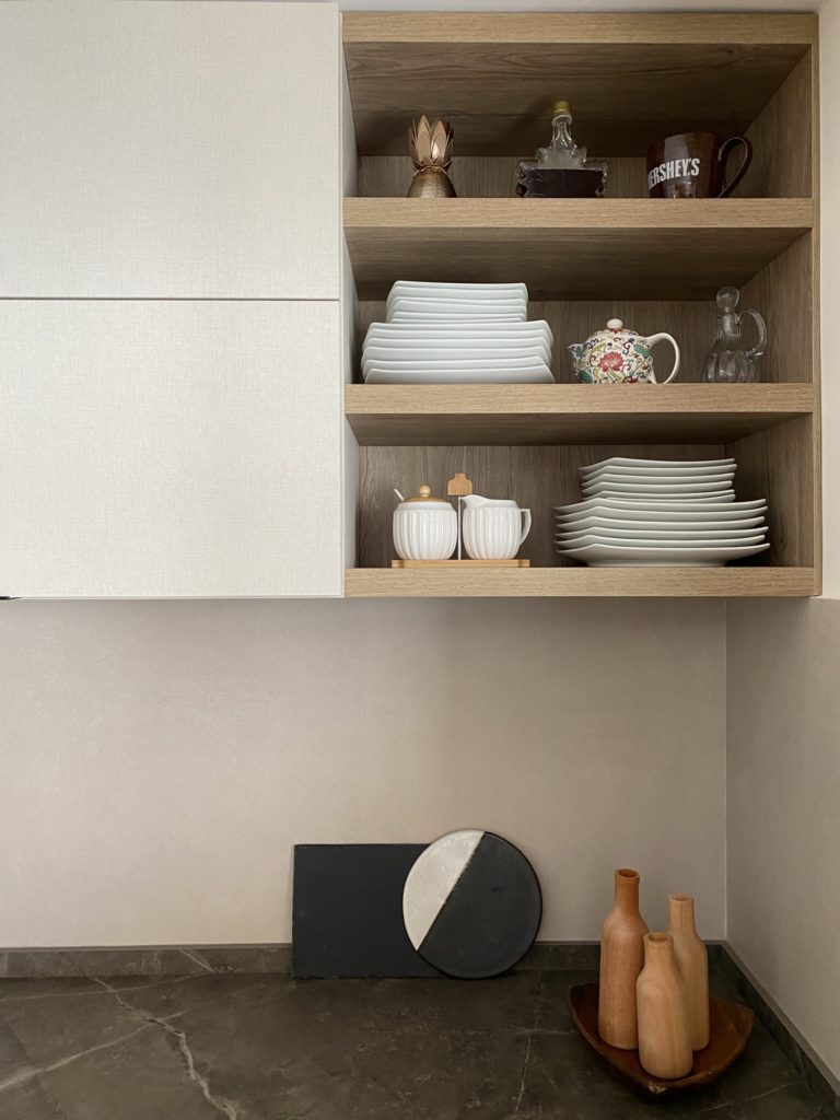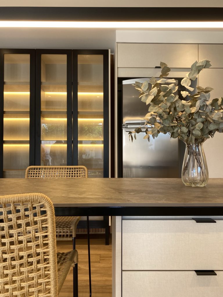 "Todo fue pensado en detalle: una buena cantidad de espacio de guardado, sector para vinos, repasadores, cuberteros a medida, verduleros, tacho doble de reciclado, etc.", explica la Arquitecta. Y agrega: "para complementar el gran espacio de guardado, diseñamos un vajillero a medida con iluminación, para poner a la vista todas las cosas lindas de la cocina y detalles deco".
