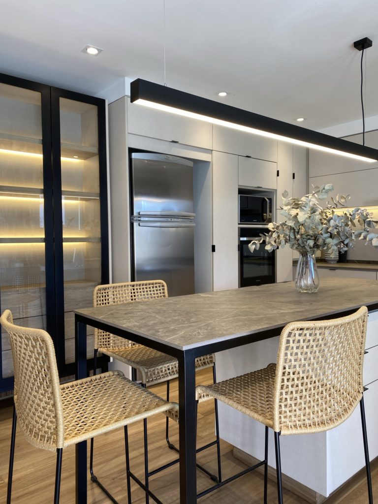 Y concluye: la iluminación para nosotros es siempre una prioridad. Bajamos el techo con durlock para embutir los spots y sobre la isla, colocamos una colgante lineal. Nunca puede faltar la iluminación led bajo las alacenas y el detalle de iluminación en el vajillero. Los materiales que usamos fueron porcelanatos en pisos y paredes, dekton, melamina, hierro y madera".