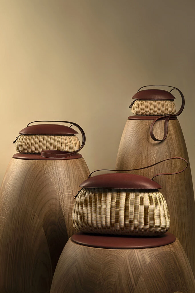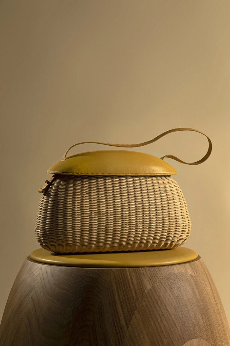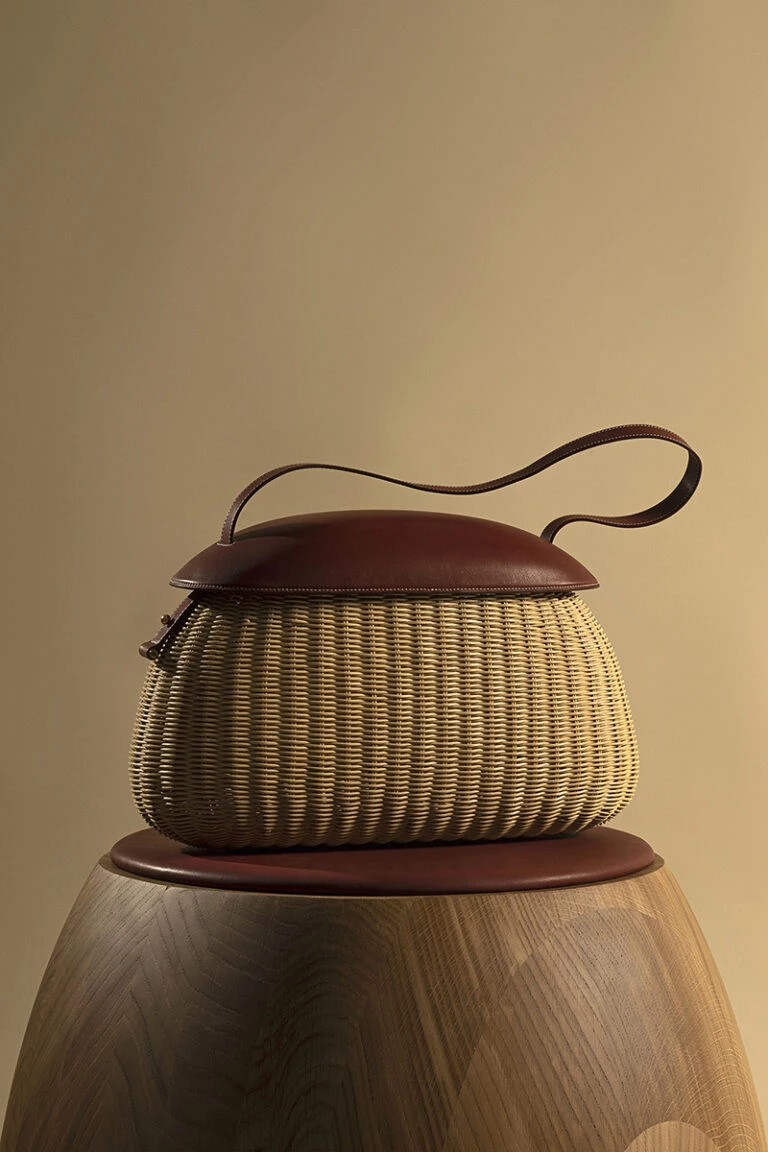 La base del bolso está realizada en mimbre tejido a mano, mientras que la parte superior está confeccionada en piel Velvet Calf, termomoldeada en 3D para dar vida a un cierre que queda casi suspendido, pero muy seguro.