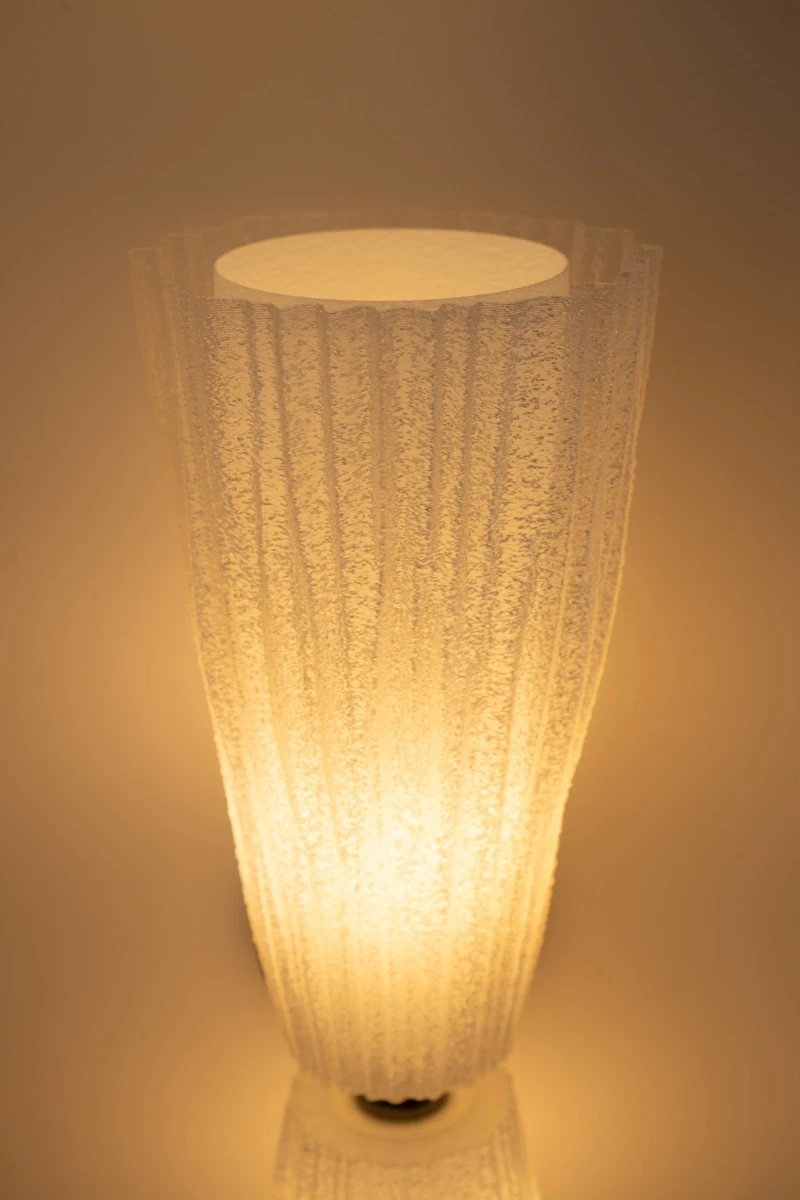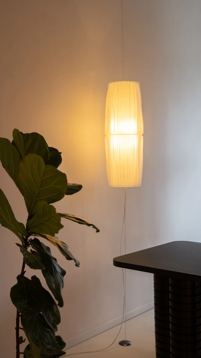 Fabricada en PLA biodegradable mediante manufactura digital, Efímera se compone de dos capas de material -una interna blanca y otra externa translúcida- lo que genera un efecto de profundidad y volumen que juega con la percepción.