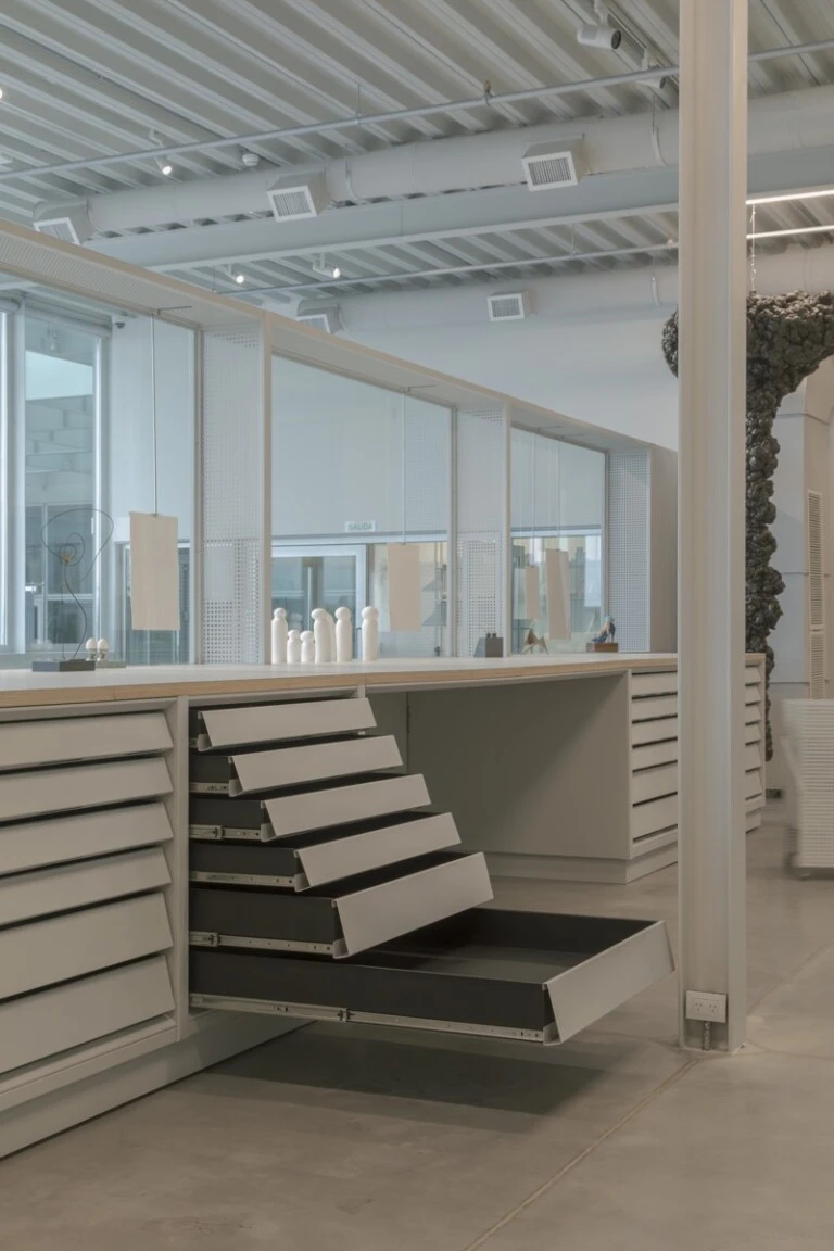 Los dos espacios se separan mediante una gran vidriera, un recurso que convierte la guarda en un paisaje visible y permite que el visitante observe aquello que, en la mayoría de los museos, permanece oculto.