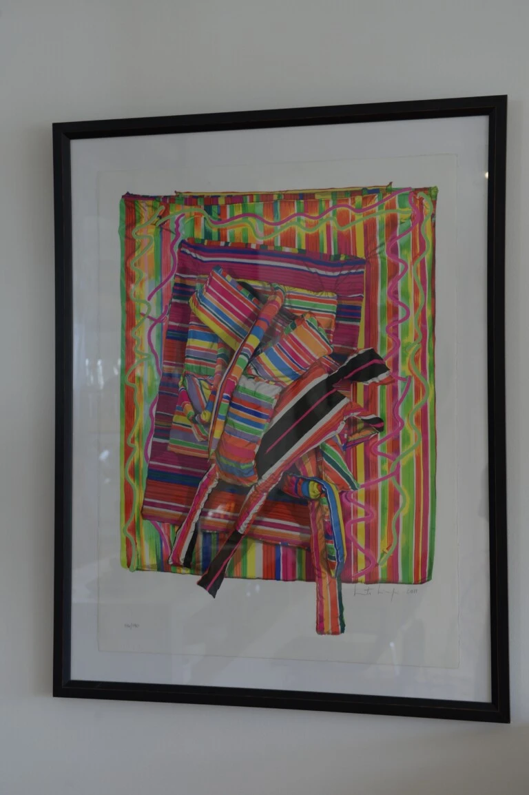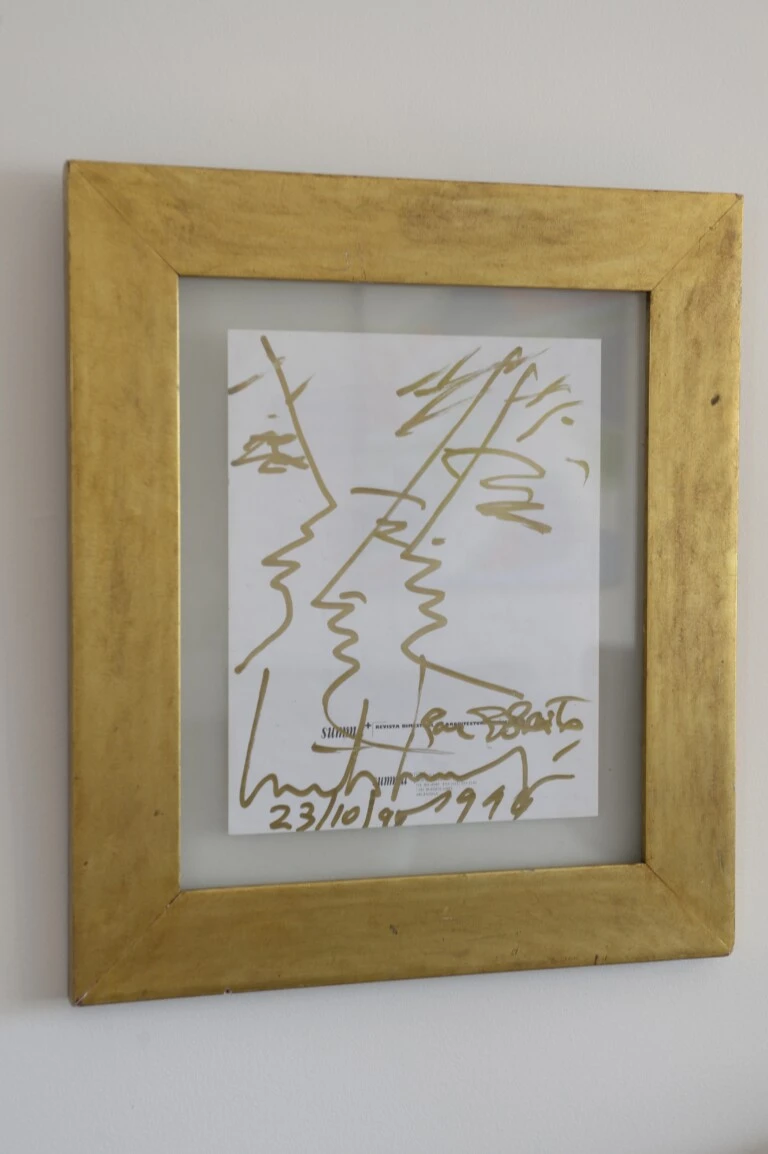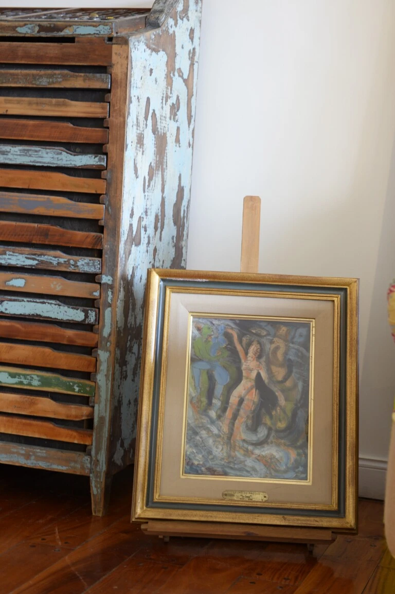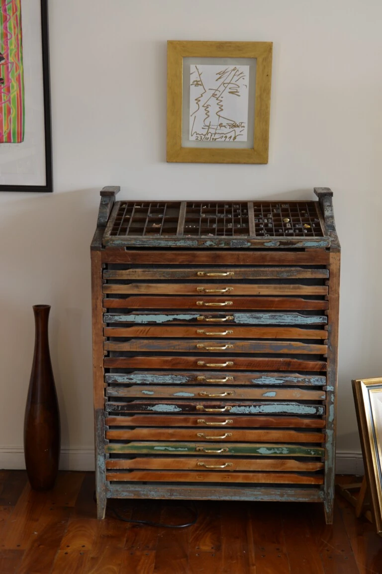 En el living. Llama la atención un mueble antiguo de imprenta. Bellísimo. Arriba, un original de Marta Minujín pintado con un marcador dorado, de 1996, y una litografía que la genial artista visual pop argentina le regaló e “intercambió” por un par de vestidos.