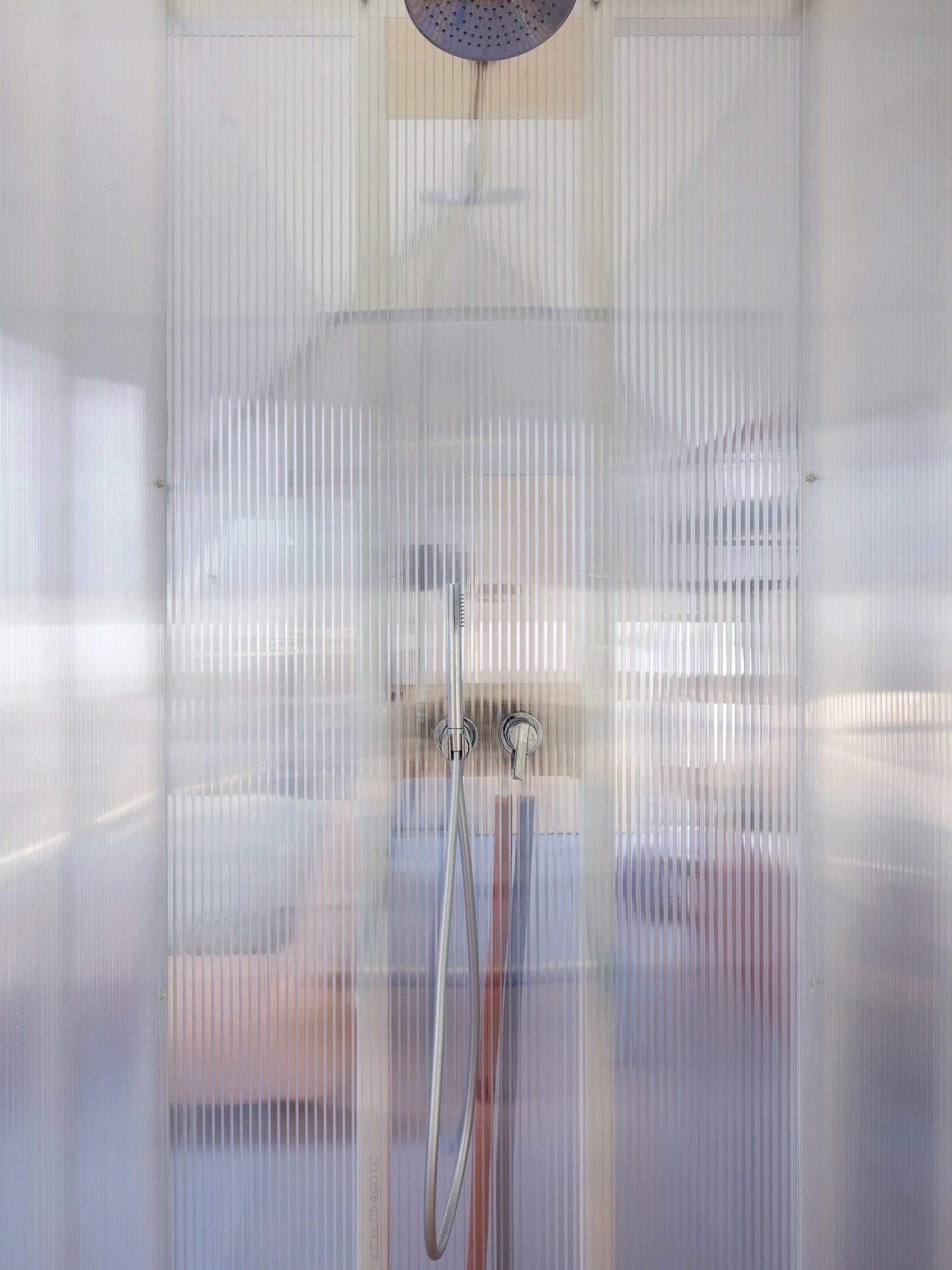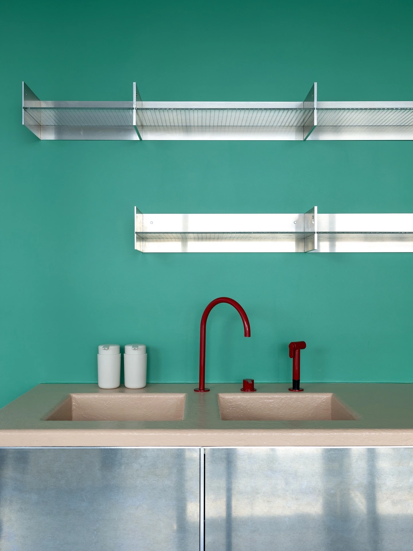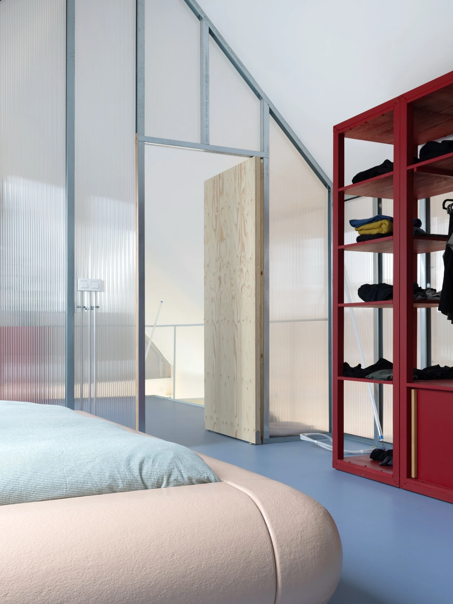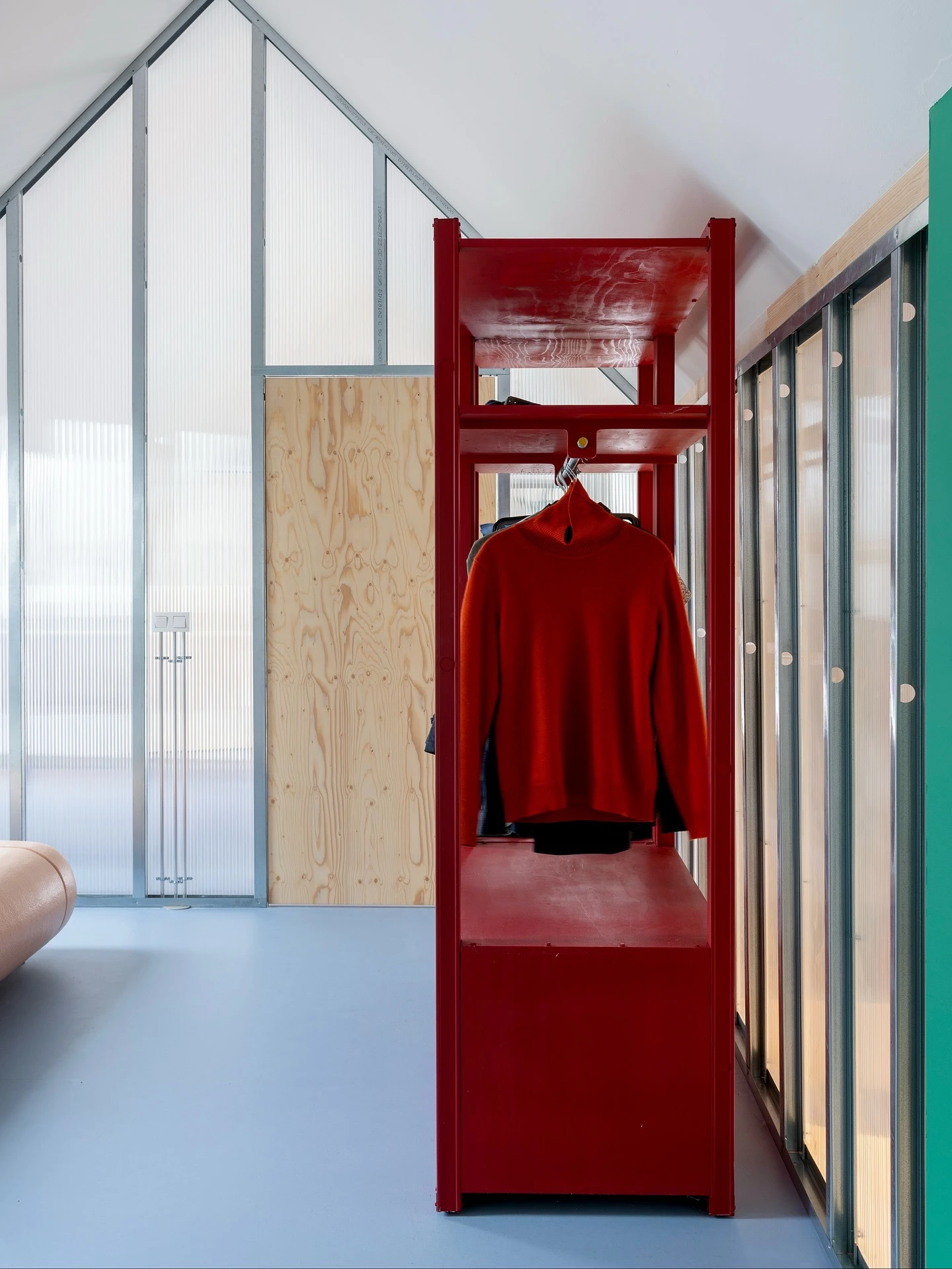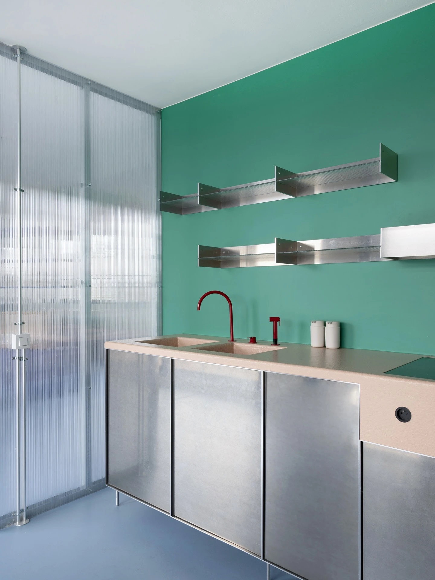 Metal, policarbonato y madera contrachapada se fusionan en un proyecto inspirado en Le Corbusier, con irresistibles toques de color: plata, verde, rojo y rosa.
