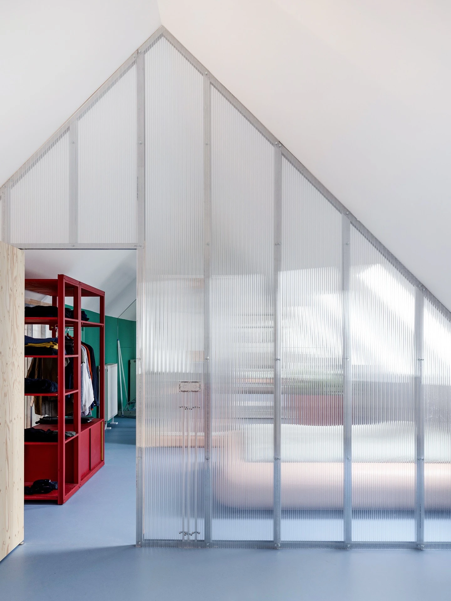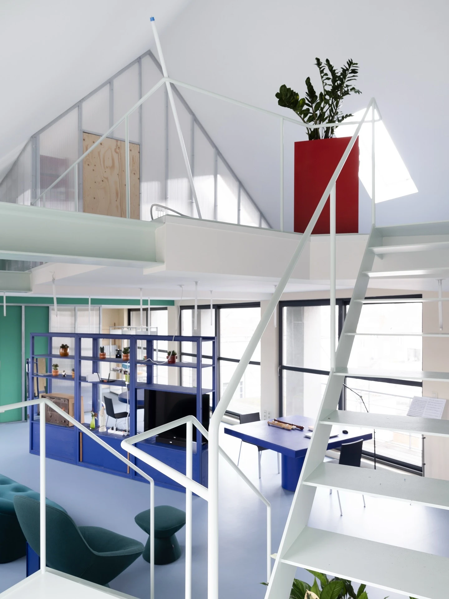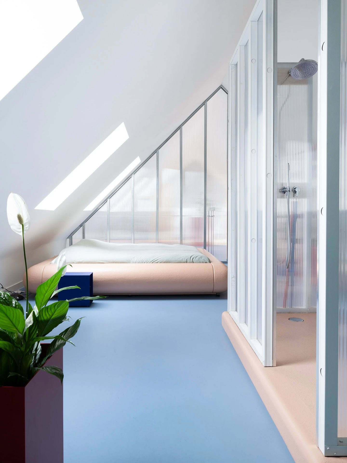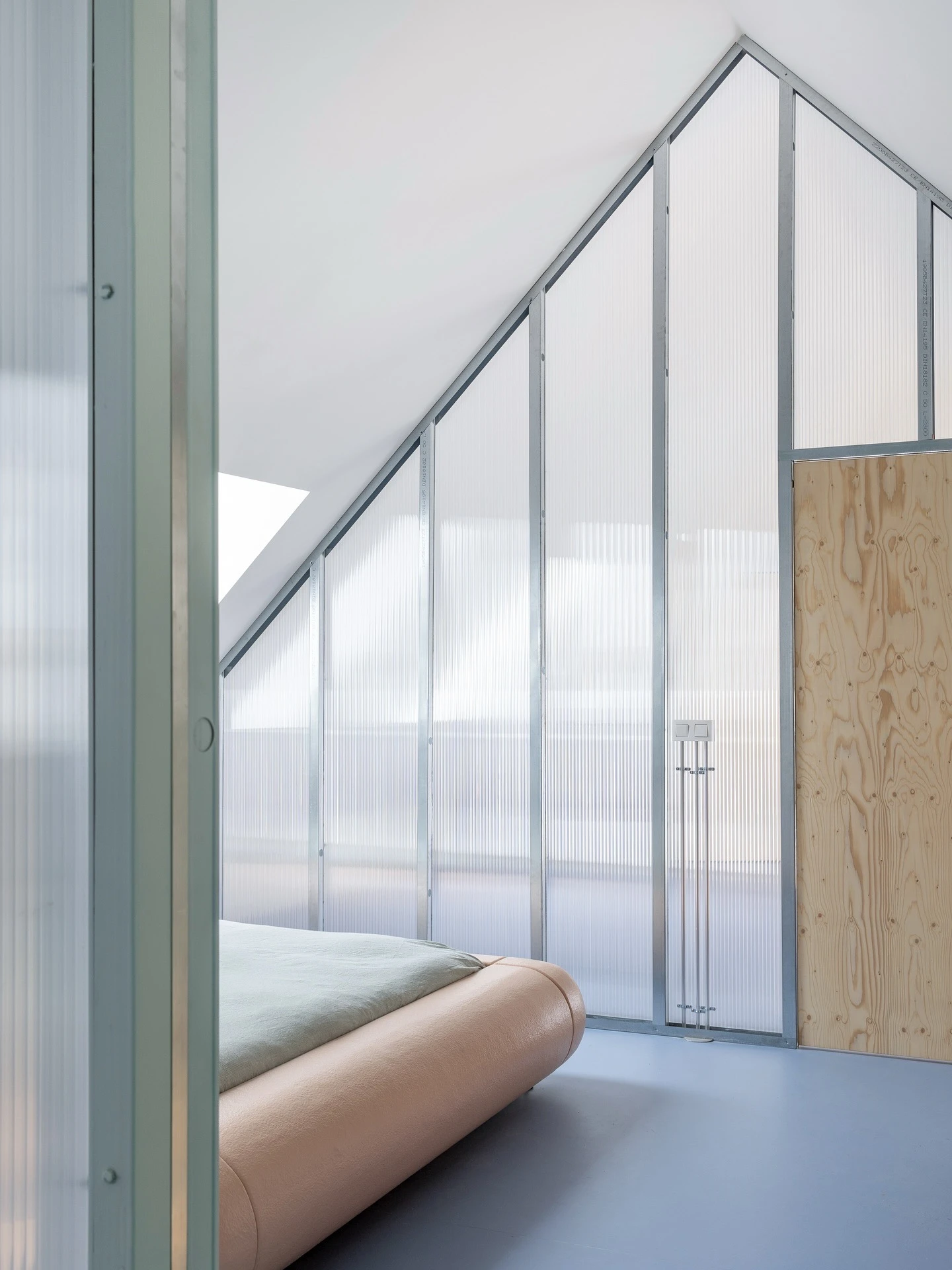 Metal, policarbonato y madera contrachapada se fusionan en un proyecto inspirado en Le Corbusier, con irresistibles toques de color: plata, verde, rojo y rosa.