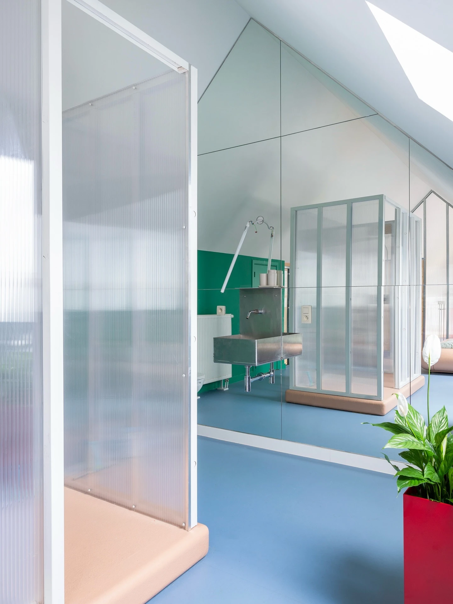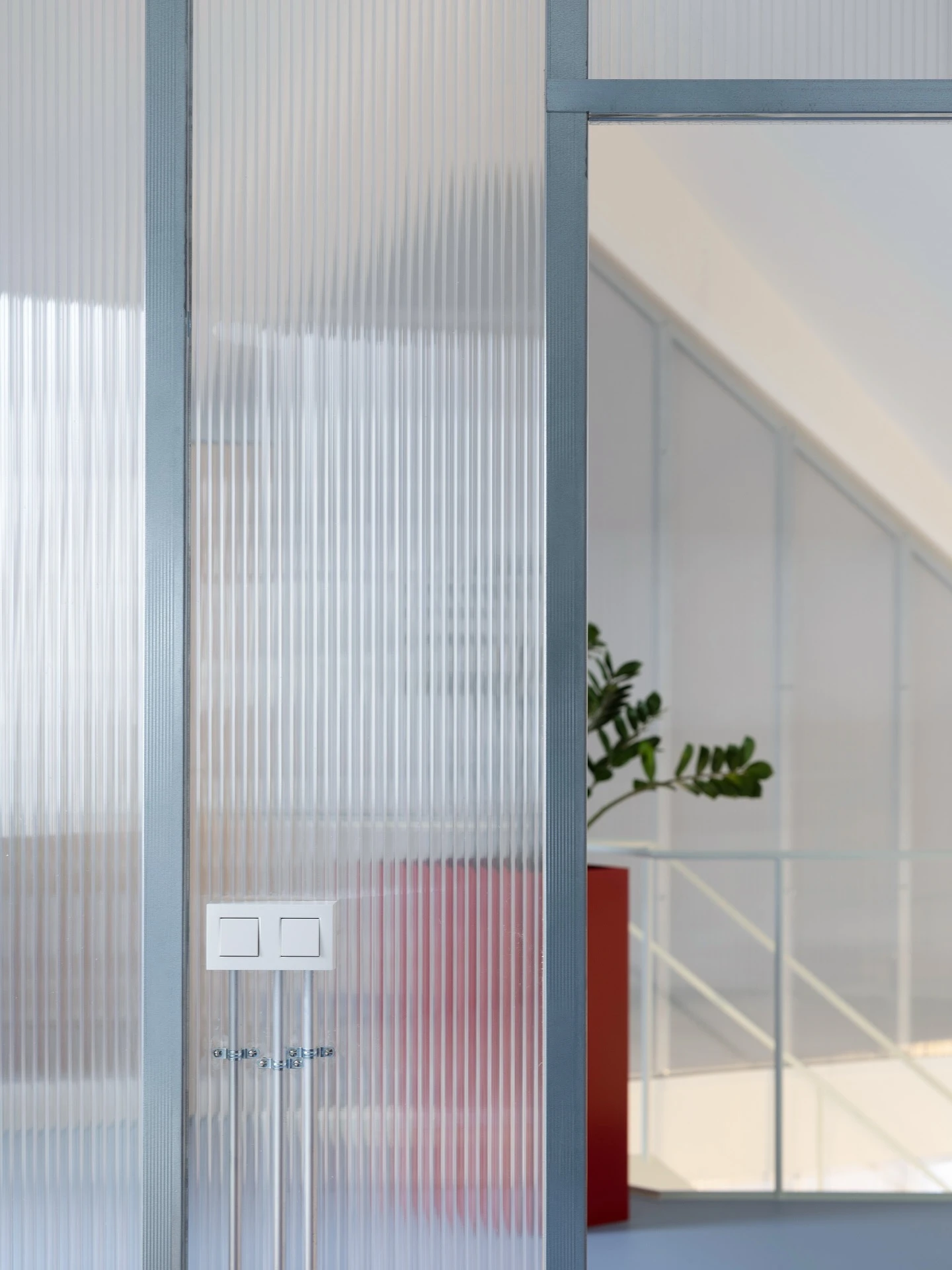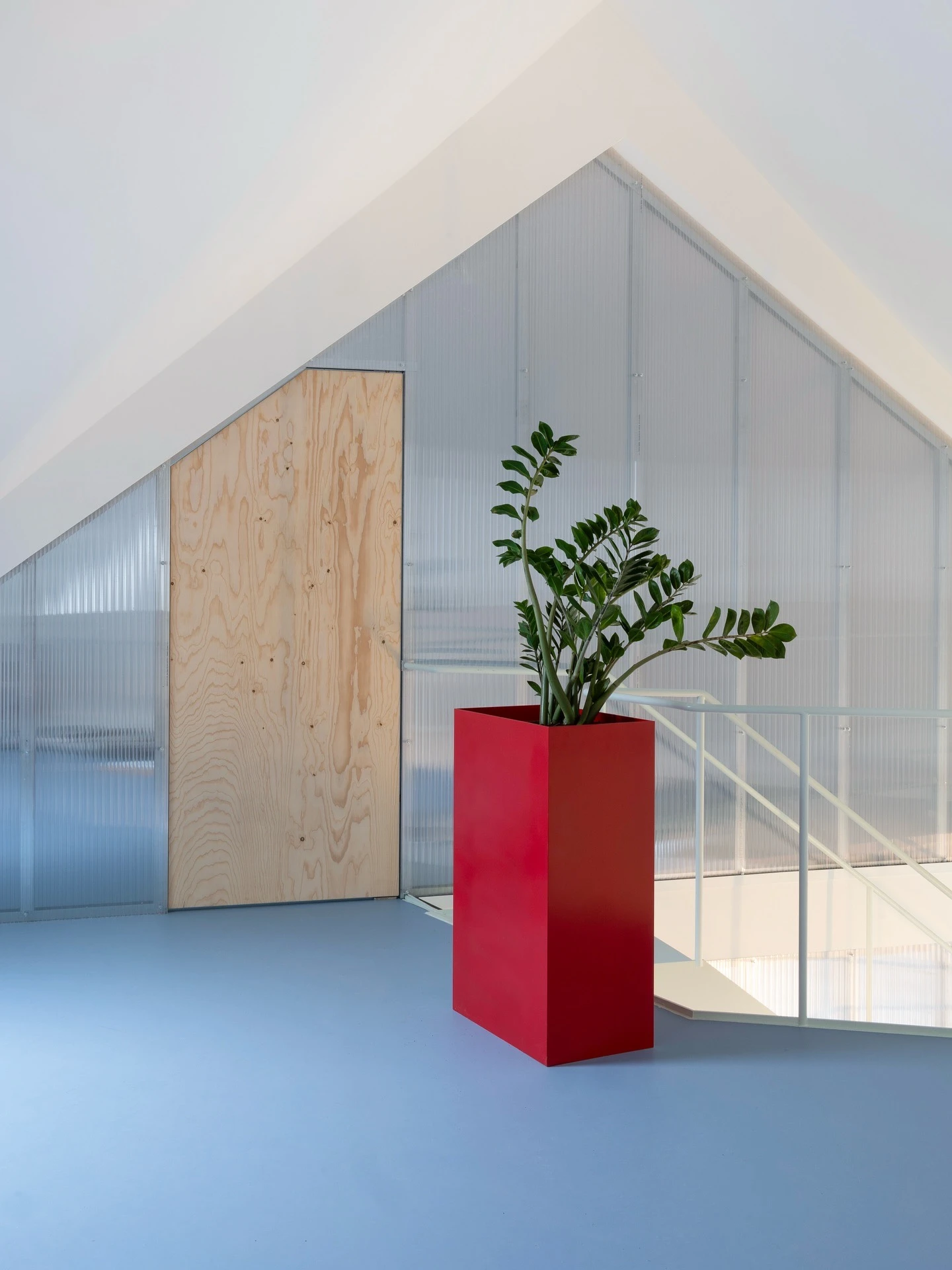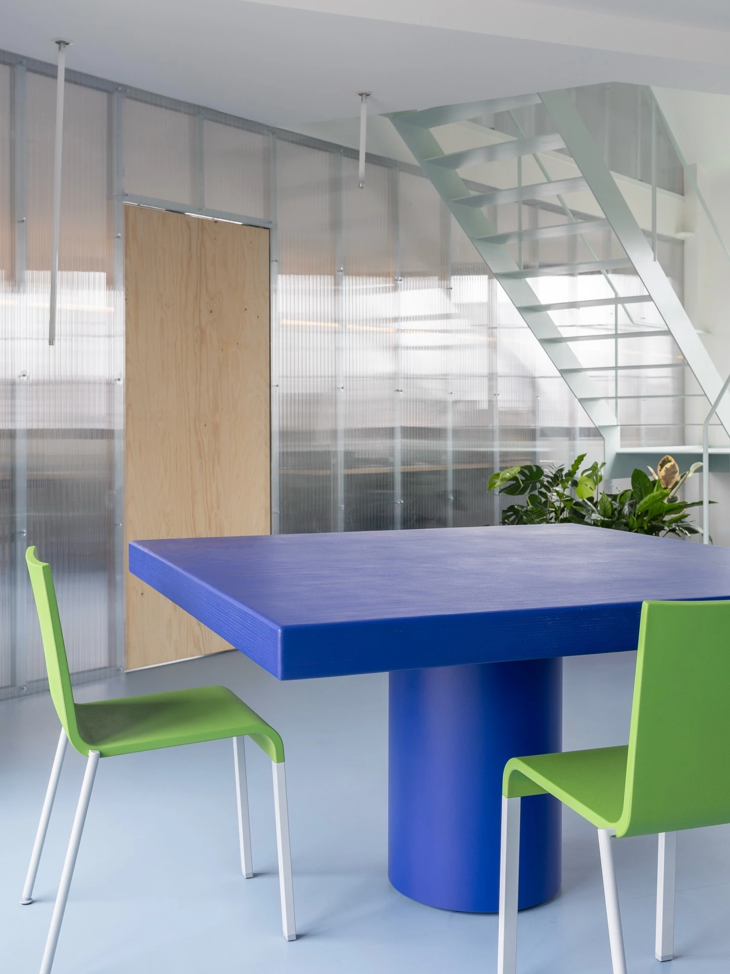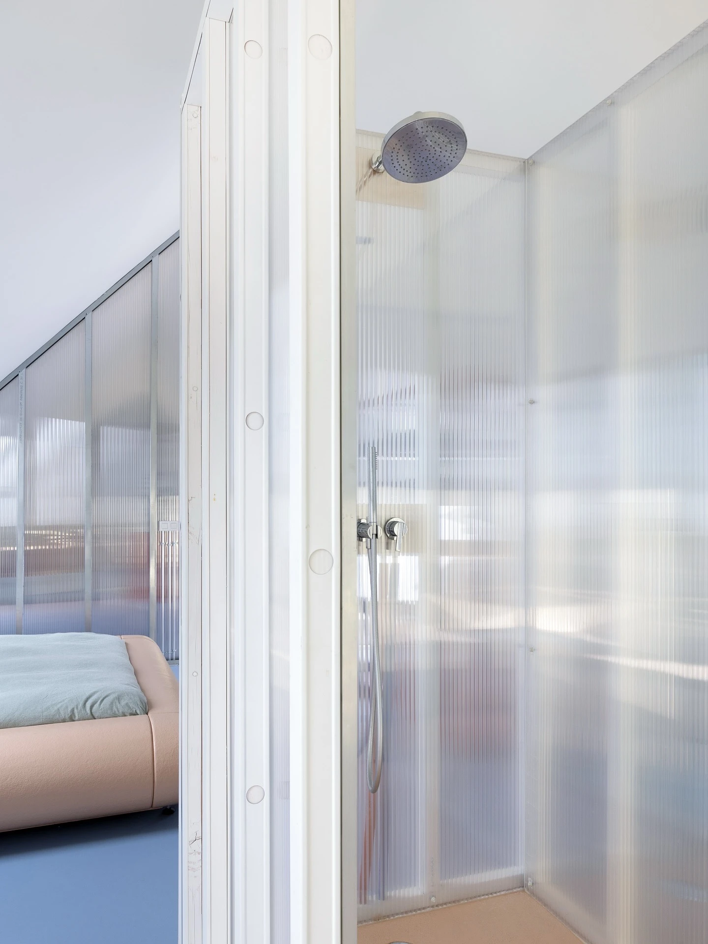 Metal, policarbonato y madera contrachapada se fusionan en un proyecto inspirado en Le Corbusier, con irresistibles toques de color: plata, verde, rojo y rosa.
