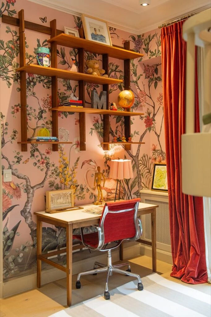 El escritorio, también en petiribí y laca verde -otro diseño del estudio- se completa con una biblioteca colgante (@quintohome). Silla rosa (Estudio T). Los pisos son de porcelanato (Ilva).