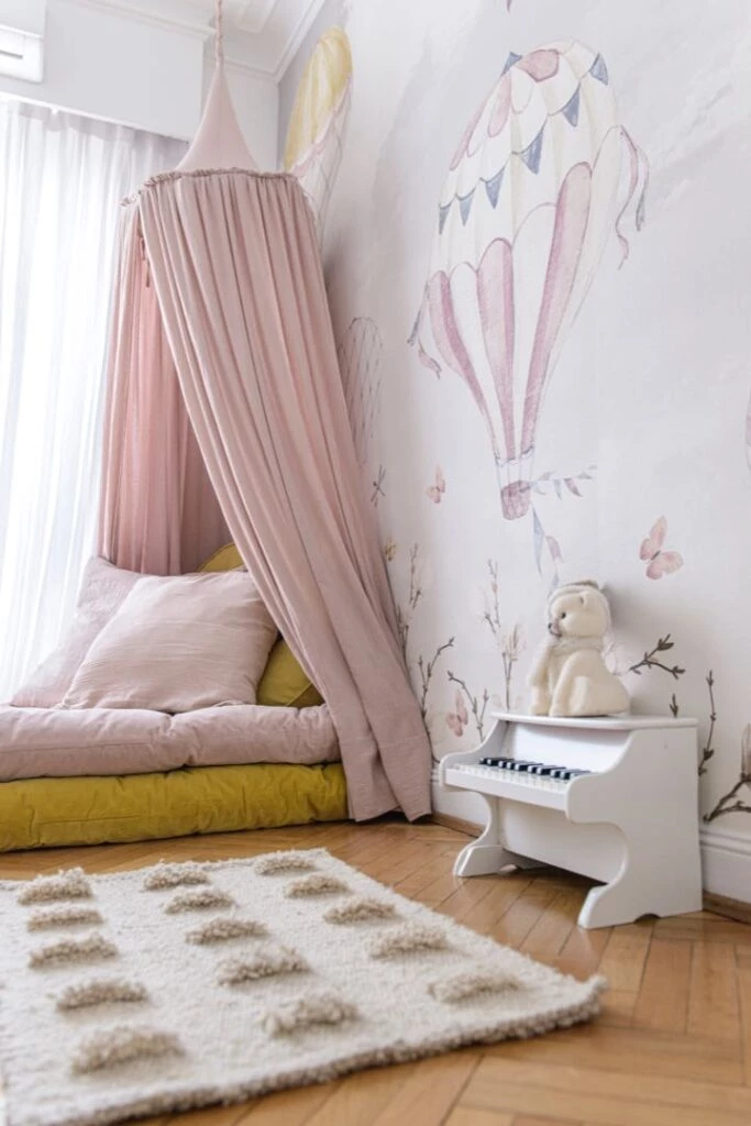 En este proyecto integral de Alejandra Galvalisi (@alejandragalvalisi) pensado para una niña de 2 años, priman la calidez, la armonía y la luminosidad. En un rincón, dos almohadones XL con dosel de gasa de algodón (diseño de Sofía Mattioli de @lasucursaldesign con géneros de Casa Almacén), proponen un original rincón de lectura.