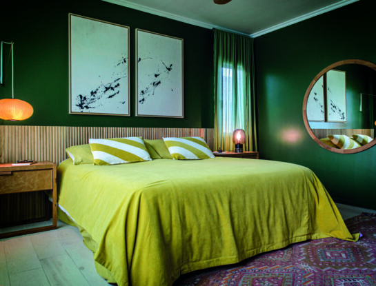 En este caso, el elegido fue un verde hoja (código 0746 de Sinteplast) inspirado en el bosque brasilero. Intenso y cargado de personalidad, este tono con voz propia se potenció con otros detalles en amarillo, durazno e incluso pinceladas de lilas, que aportan un cálido contraste. Ropa de cama y cortinas (Casa Almacén) y díptico sobre la cabecera (Natural Art).