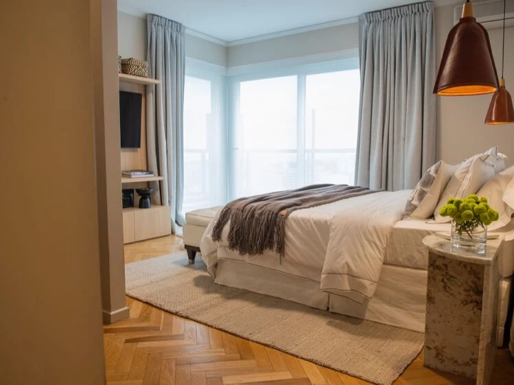 Esta máster con vista panorámica ofrece una cama king size con diseño box tapizado, respaldo en en pana guanábana y blanquearía en tonos grises con acentos de color en almohadones y manta de pie de cama en tono terracota.