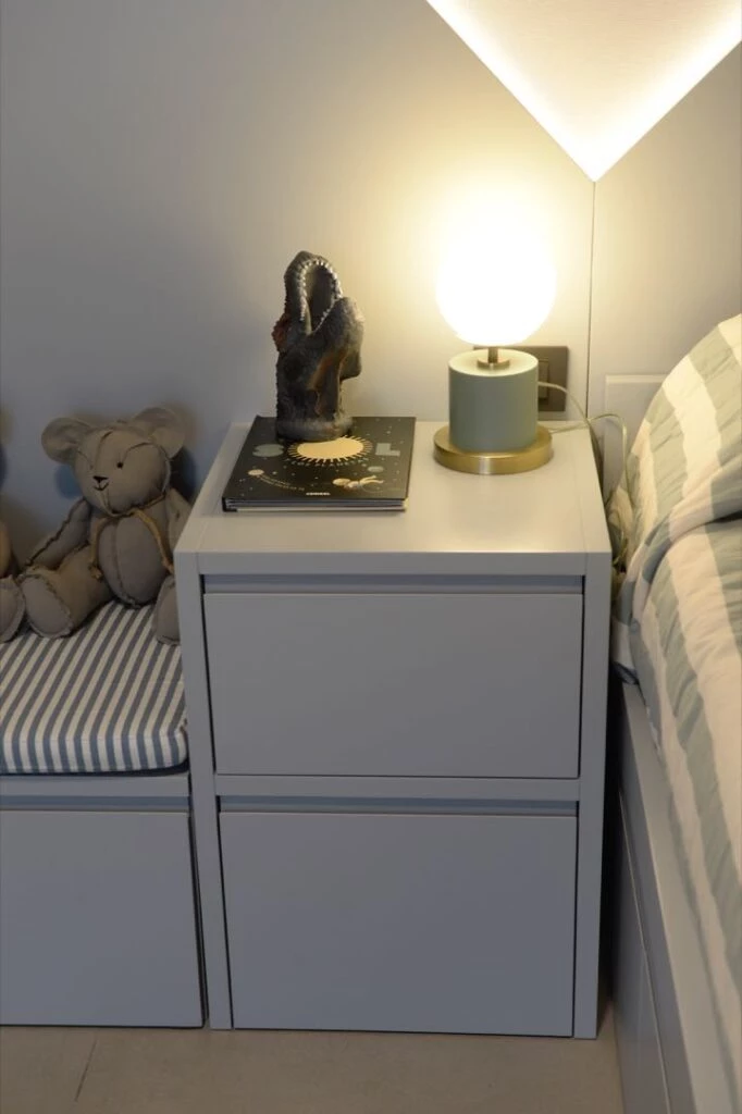 Un dormitorio para dos hermanitos con una propuesta innovadora y buenos espacios de guardado. La ingeniosa distribución para la optimización del espacio favorece el orden y la organización. Todo acompañado por un diseño de montañas iluminadas que sigue el perímetro de la habitación y es protagonista.