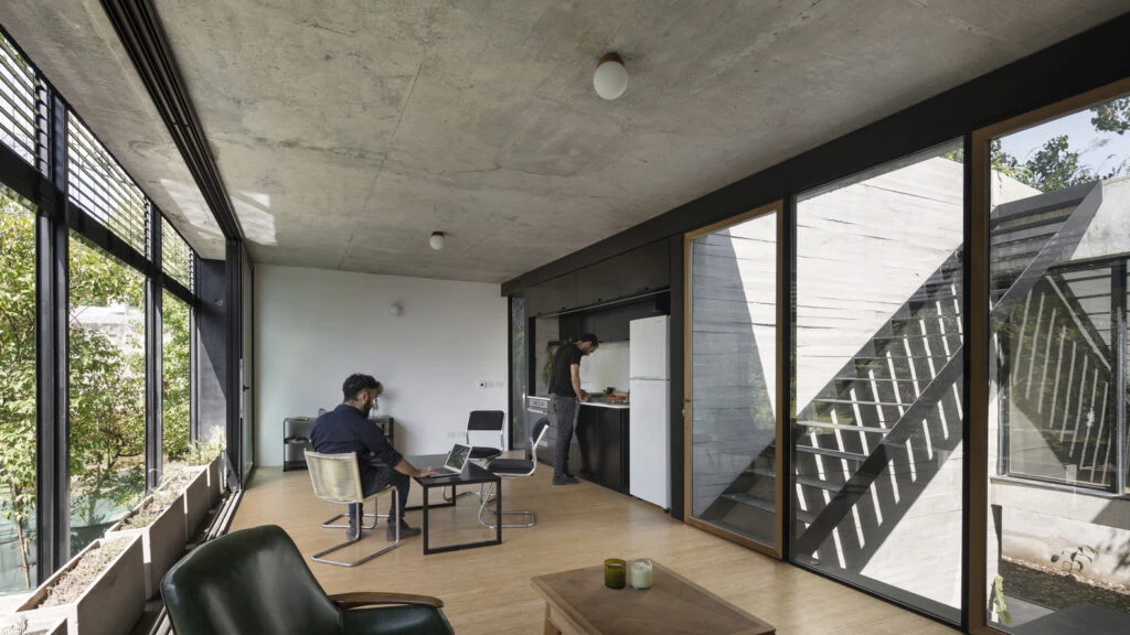 El volumen construido se separa un metro de los límites laterales del terreno, garantizando independencia respecto a los vecinos y facilitando la circulación de aire.