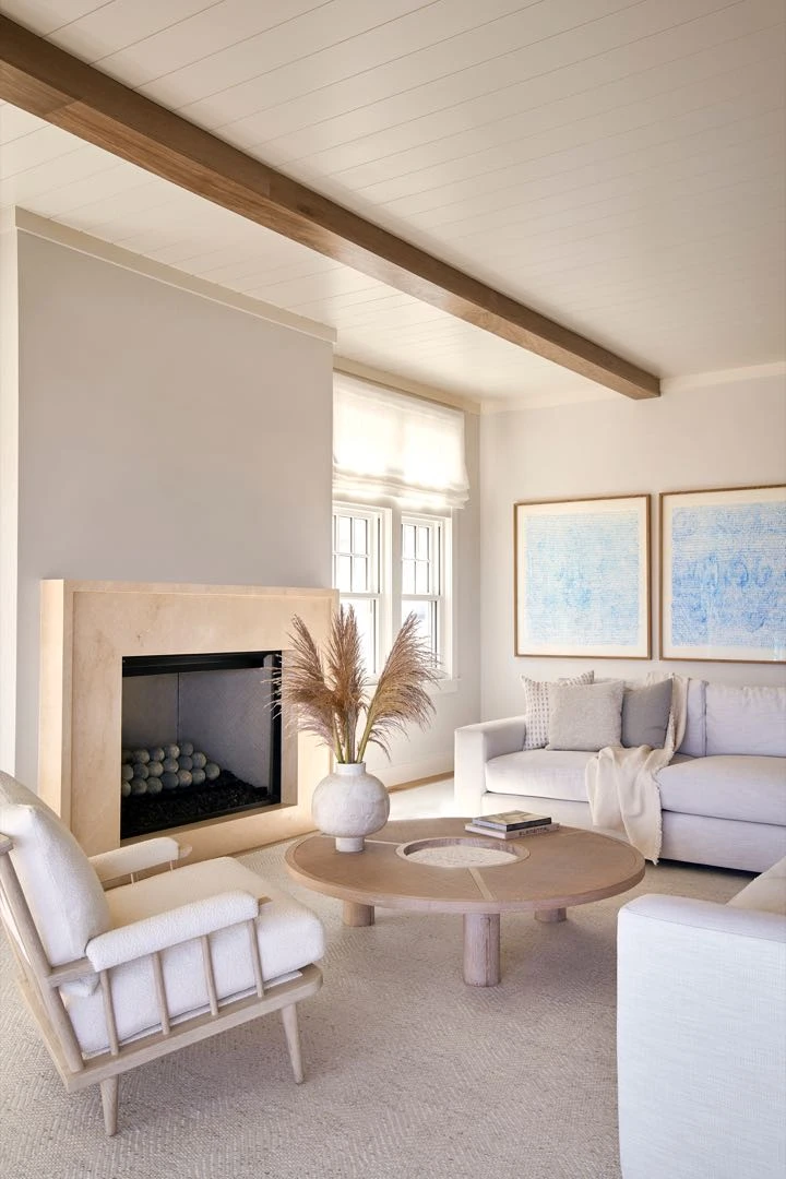 La mesa de arrime de fibrocemento (sundayshop.com) se apoya contra el sofá hecho a medida (buildlane.com), acompañado de sillones son de un cuerpo de roble blanqueado (nickeykehoe.com), mesa de centro de madera y fibras naturales (bakerfurniture.com) y una gran alfombra realizada a pedido (saccocarpet.com).