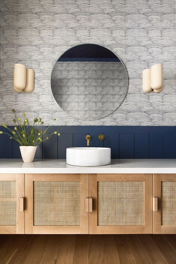 Tal es el caso de uno de los ocho baños que tiene la casa, donde se destaca un papel tapiz en tonos azulados que evoca el movimiento de las olas (pierrefrey.com) que es el marco perfecto para el mueble bajo pileta de madera y esterillado.