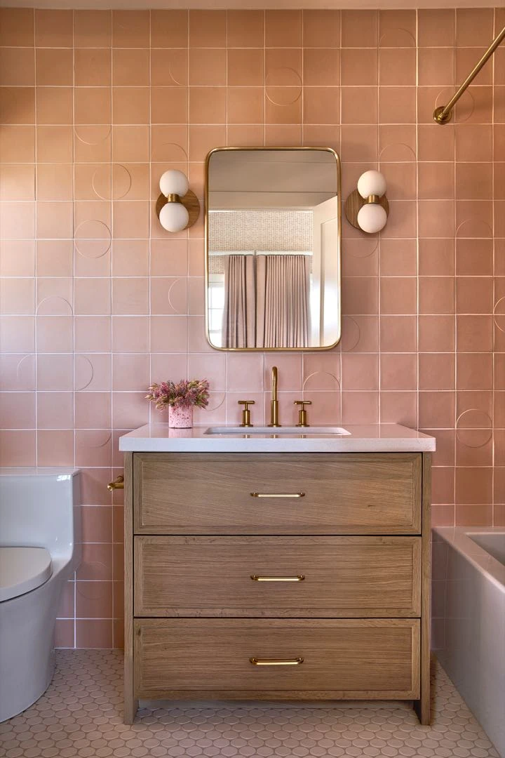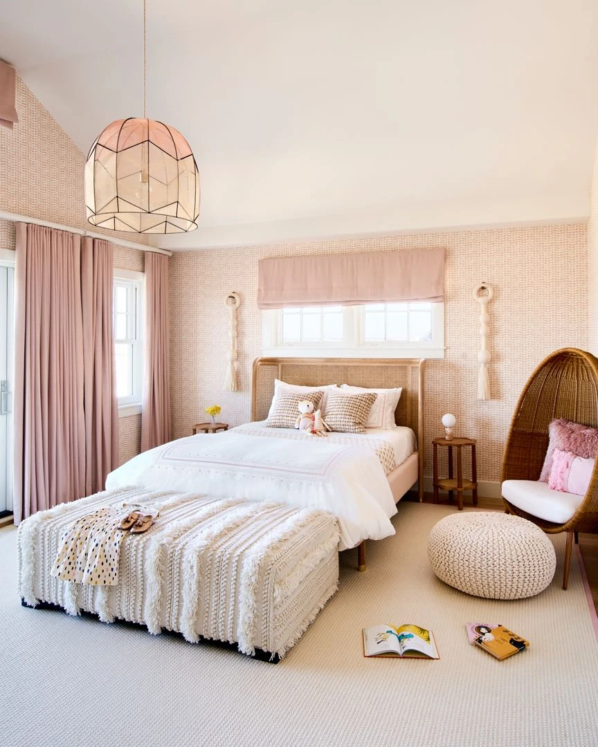 El dormitorio y el baño en suite pertenecientes a la niña de la casa introducen los tonos rosados en el papel tapiz (seemakrish.com), las cortinas (draperyrodsdirect.com), la lámpara colgante de armazón de acero e hilos de algodón (alexandraraben.com) y los azulejos que forman además un interesante patrón con relieve.
