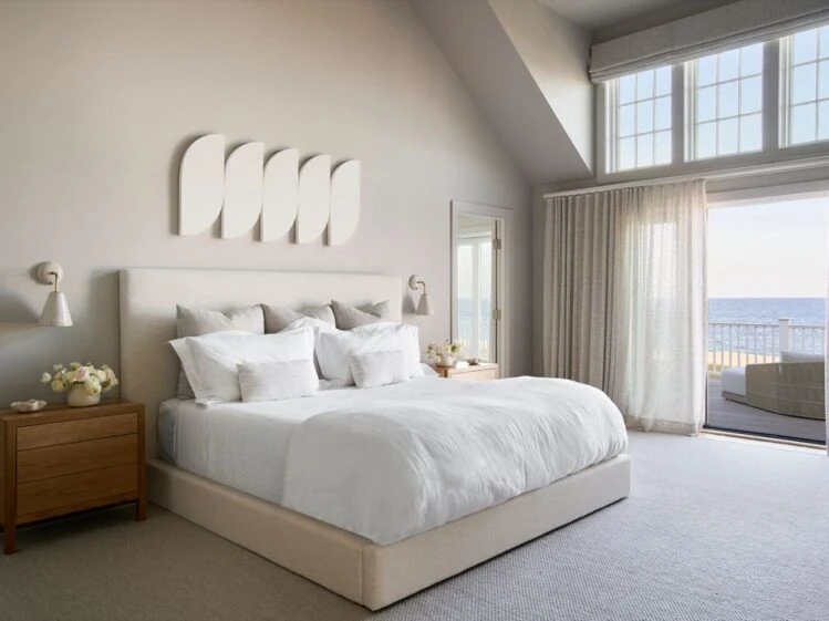 El dormitorio principal cuenta con amplias puertas corredizas con salida a una de las terrazas exteriores suspendida sobre la playa. Los muebles son de líneas limpias y colores neutrales para no distraer la mirada de las maravillosas vistas. La cama tapizada en lino natural tiene cajones en la base (rh.com) y el arte escultórico sobre el respaldo es del artista neoyorquino Dan Covert (@dancovert).