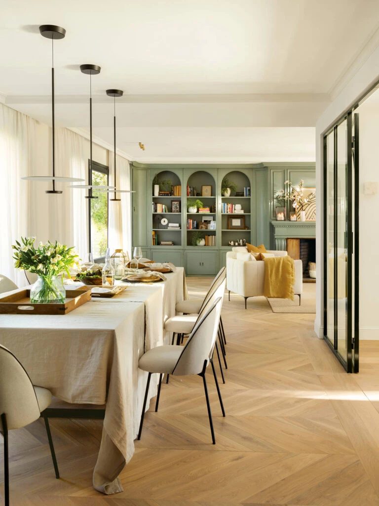 Otra de las ventajas que tienen los pisos de madera en espiga es que se pueden combinar con otro tipo de suelos sin ningún problema, desde calcáreos hasta lamas de madera horizontales y microcemento. El resultado será más ecléctico y dinámico, e incluso sirve mucho para separar visualmente zonas dentro de un mismo espacio diáfano.