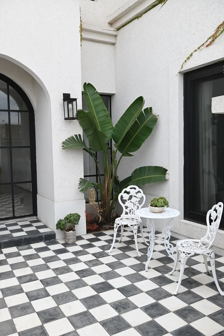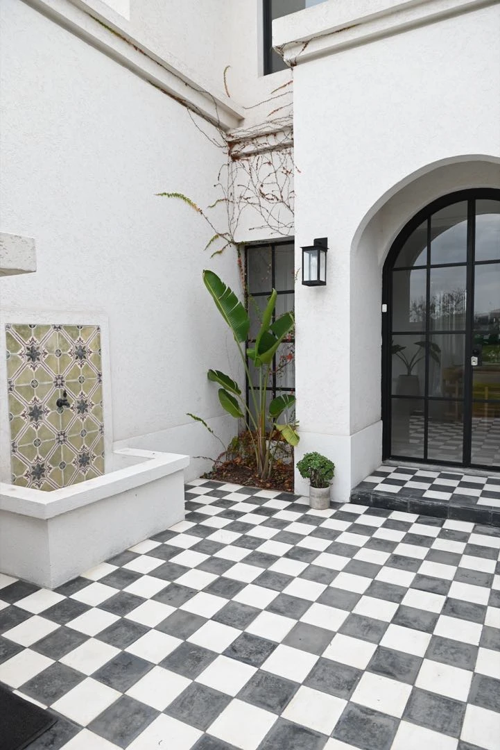 El frente de la casa tiene un diseño simétrico, con la puerta en hierro y vidrio repartido al centro. Como la vivienda tiene orientación norte y el jardín posterior recibe sol todo el día, en el acceso se sumó este patio interno que resulta el lugar más fresco para pasar las tardes de verano y al mismo tiempo, le da intimidad al conjunto al tapar el frente vidriado. Con pisos en damero, una fuente hecha con calcáreos y un grifo con diseño (Robinet) tiene todos los condimentos de un patio andaluz.