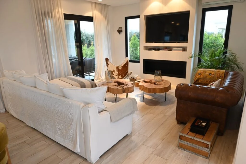 En el sector living, un mueble entablonado con nicho para la tevé y un hogar de bioetanol marca el eje hacia el que miran el sofá con funda blanca, un BKF de cuero de potro y el clásico Chesterfield. Al centro, mesas de rodaja de tronco con patas de hierro.