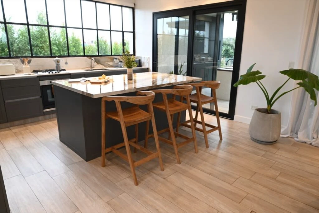 El área social es generosa y de concepto abierto, ya que se pensó con el foco en el verbo compartir (con amigos, con familia): living, comedor y cocina se unen en un gran espacio que a su vez asoma hacia la galería y el patio interno, responsables de bañarlo de luz.