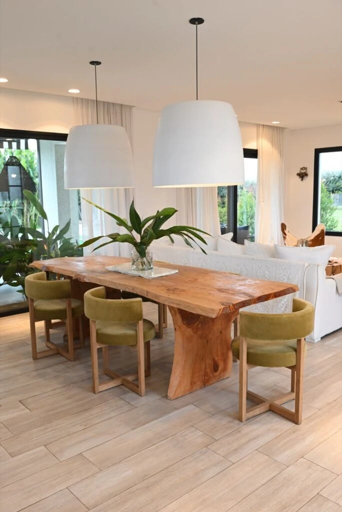 El comedor tiene la vista mas linda de la casa, ya que una de las cabeceras da a la entrada y la otra a un ventanal de paño fijo que tiene un cantero: a la hora de diseñar la casa, la prioridad fue que se pudiera ver verde desde todas las ventanas. La mesa es de guayubira, bien rústica, acompañada de sillas de respaldo envolvente tapizadas en pana. Las cortinas de toda la casa son de gasa pañalera.