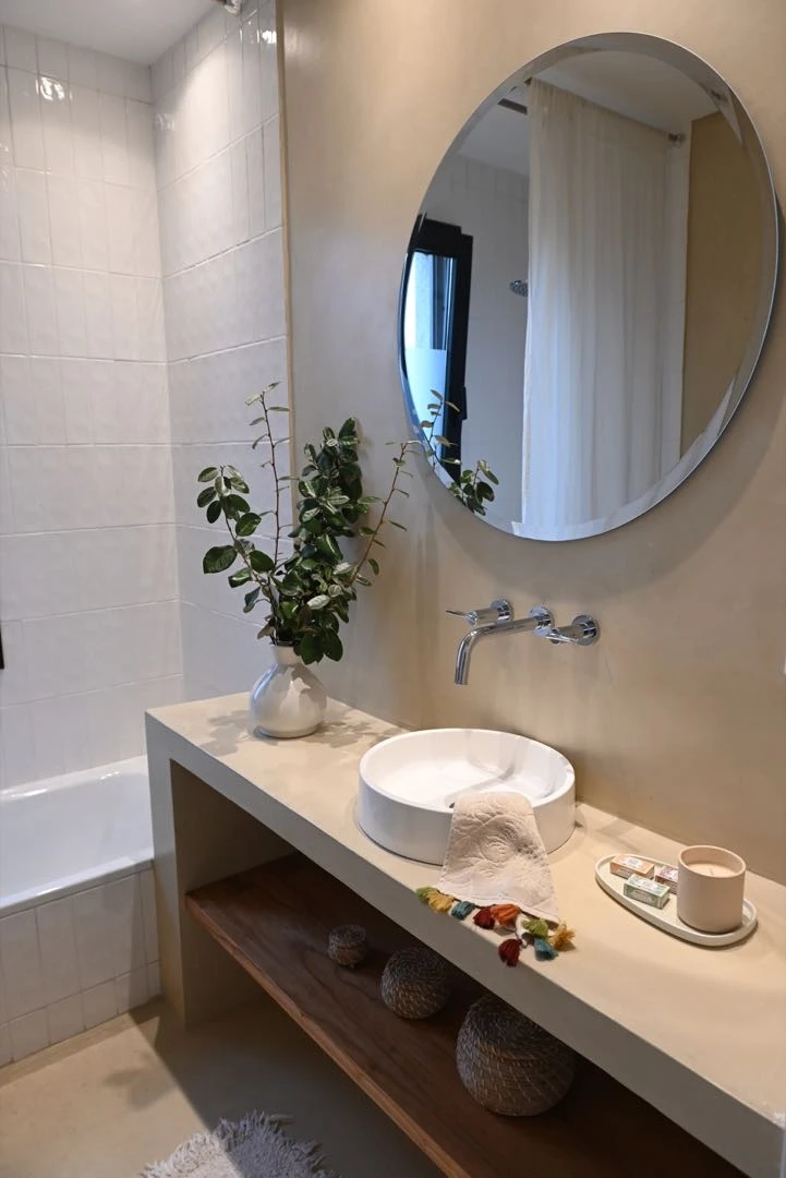 Los baños de la planta alta tienen el mismo diseño, totalmente revestidos en microcemento con excepción del área de ducha que lleva azulejos Zelliege. Las griferías son modelo Livy (FV) con bachas de apoyo de Cree (Barugel).