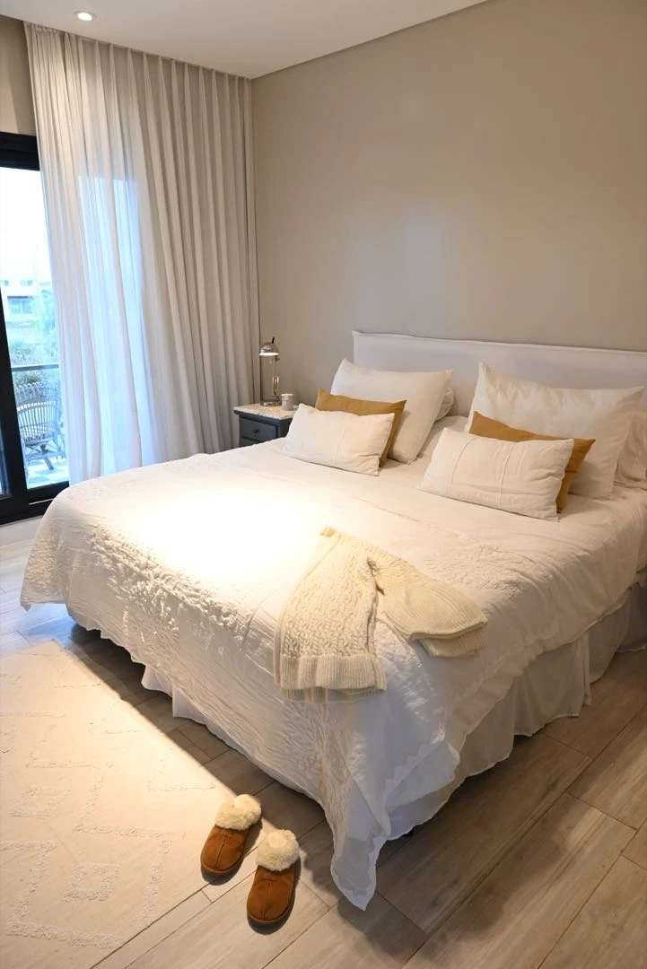 La master suite está precedida por un hall de distribución que da al vestidor y al baño, y fue tratada como un auténtico lugar de descanso, con pocos elementos y una paleta clara que genera calma. Solo las mesas de luz con tapa de Carrara dan el toque de color junto con los veladores (Ikea). Las cortinas son de doble riel con black out y gasa pañalera y cuelgan desde un cajón que permite ocultar el riel: un esquema que se repite en todos los ambientes.