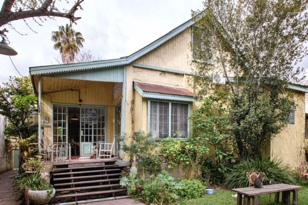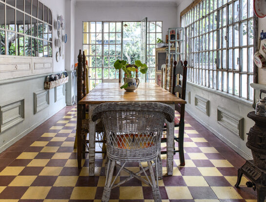 El comedor diario de la casa, resuelto en una suerte de jardín de invierno bendecido con unos ventanales de hierro y vidrio repartido por donde se cuela el verde exterior. Puertas antiguas de pinotea y pisos calcáreos originales son también de la partida. Al centro, una mesa rústica que la dueña de casa, la artista plástica Ana Vidal, realizó con maderas recicladas de cajas de maquinaria fabril, junto a un popurrí de sillas llegadas de distintos lados (Ana se confiesa habitué de cuanto anticuario se cruza por su camino).