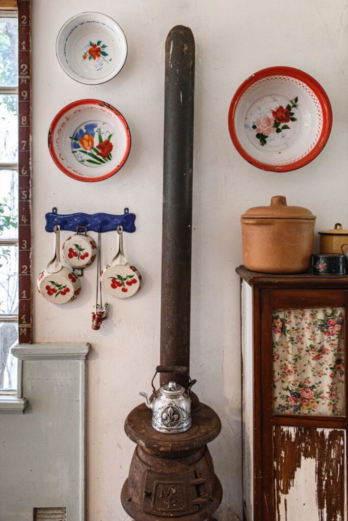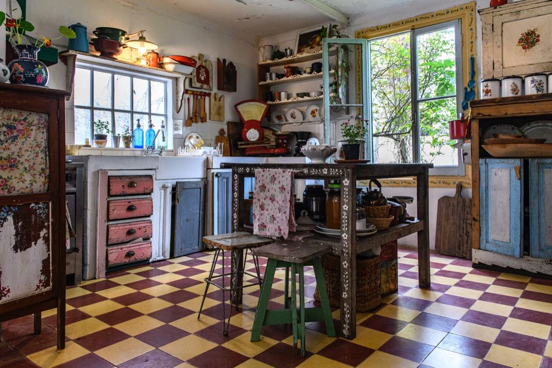 La vieja cocina, con sus pisos en damero, ofrece un exquisito menú de detalles: abundan aquí los platos enlosados, sifones de vidrio y otros cacharros de época, sobre repisas, tablas y muebles que cuentan siempre con alguna intervención de la dueña de casa. La mesa de centro, tipo isla, suma unos banquitos de tiempos de la abuela, y hasta manteles y repasadores dan la nota vintage.