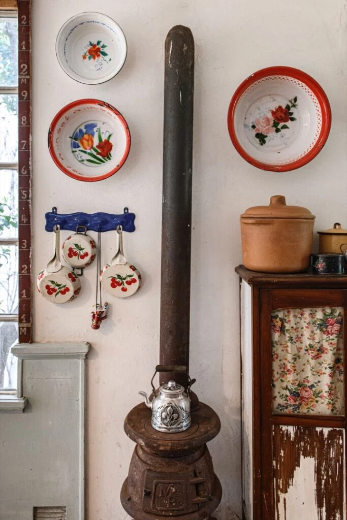 Otro sector del living. La salamandra (Tromen) llegó a la casa un día frío de invierno (fue un regalo de la mamá de la dueña de casa) y aún hoy, es la única fuente de calefacción. La acompañan, sobre las paredes de machimbre originales, obras hechas por ella (@anetavidal), por su marido (@negrovachino), su hijo (@salvadorvachino) e incluso su hermana (@consuelovidalsoy ) más otros cuadros que Ana fue encontrando por el camino.