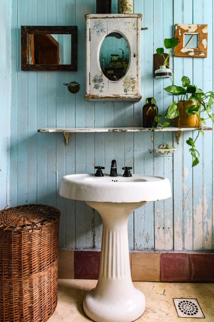 El baño está íntegramente revestido en el machimbre original que Ana pintó de celeste; y el piso es de cemento alisado. El botiquín antiguo aparece intervenido con flores y los espejos están armados con viejas maderas.