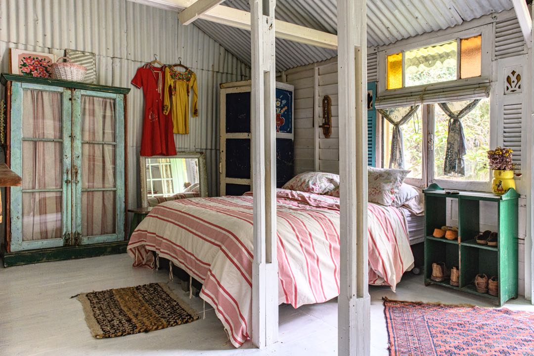 Una imagen del dormitorio principal, que originalmente era el taller de la dueña de casa y que mantuvo su rusticidad, con sus techos y paredes en chapa. “Cuando quedé embarazada de Carmen, única mujer de cuatro varones, decidí transformar el taller en mi cuarto y le sumé un baño para hacerlo en suite”, detalla Ana.
