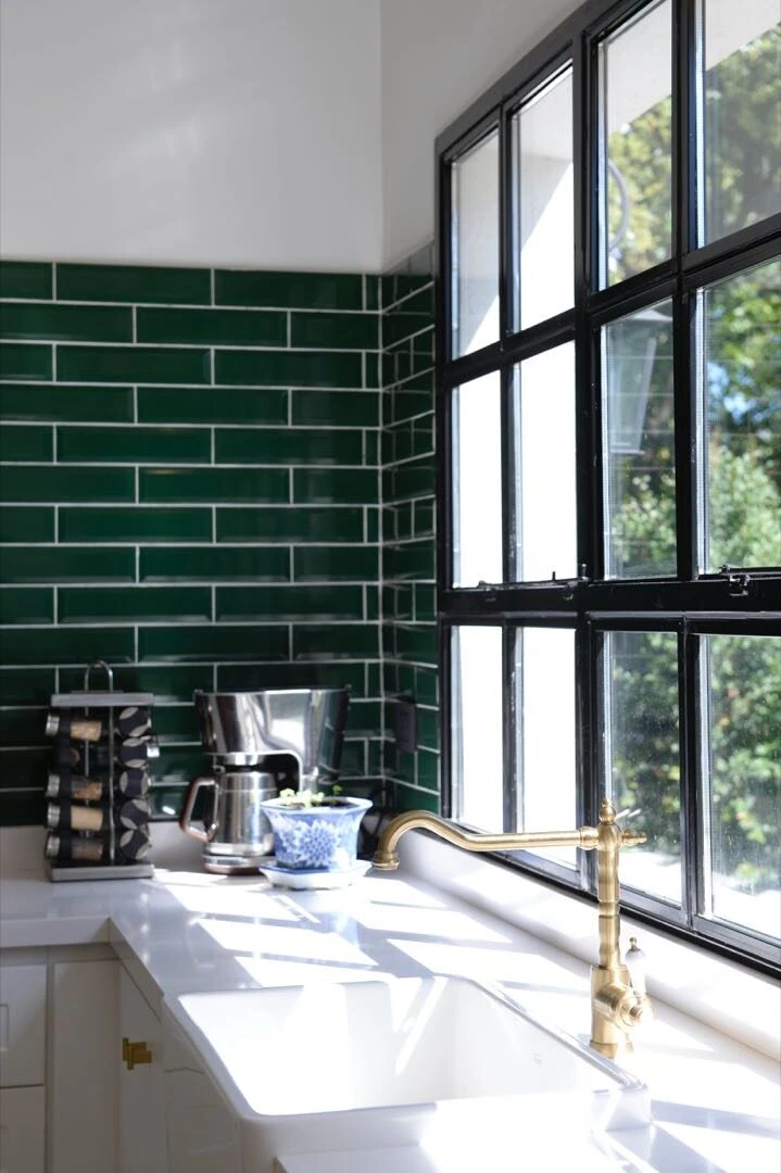 Toda la alzada frontal se tapizó con azulejos subway verdes que elevaron el color fetiche de esta cocina: también se lo puede ver en el dibujo de los pisos y en los herrajes de los diferentes cajones de la isla. Por último, dos grandes ventanales de hierro y vidrio repartido bañan el espacio de luz.