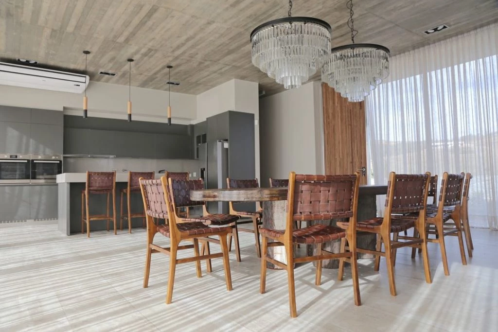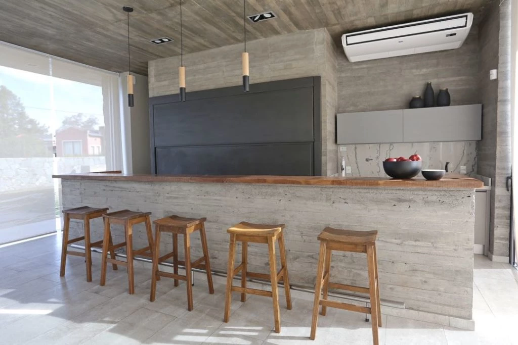 La galería central se beneficia de las maravillosas vistas hacia uno y otro lado del valle. El espacio mantiene la misma caja de hormigón visto de toda la casa, con pisos también de porcellatos en gris gastado. Siguiendo con ese esquema, propone una gran barra de hormigón que separa al imponente asador de la mesa de lapacho, con sus sillas de rattan natural (@coinvert).