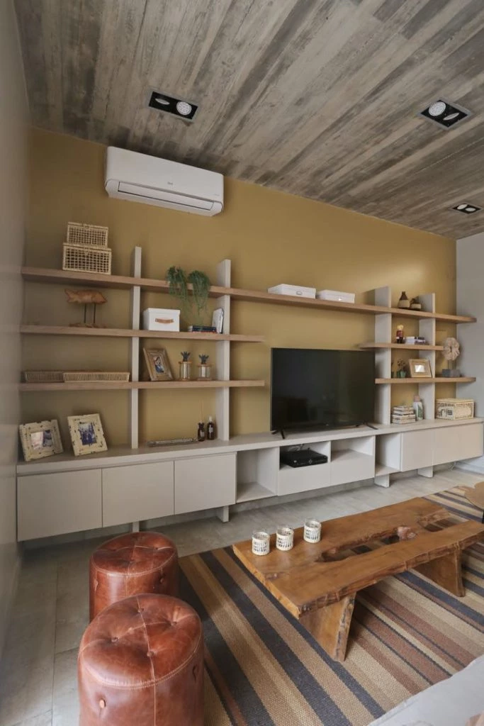 Para la sala de estar y tevé los diseñadores crearon un mueble biblioteca muy liviano, con luz cálida cenital, que resalta el color camel de la pared.