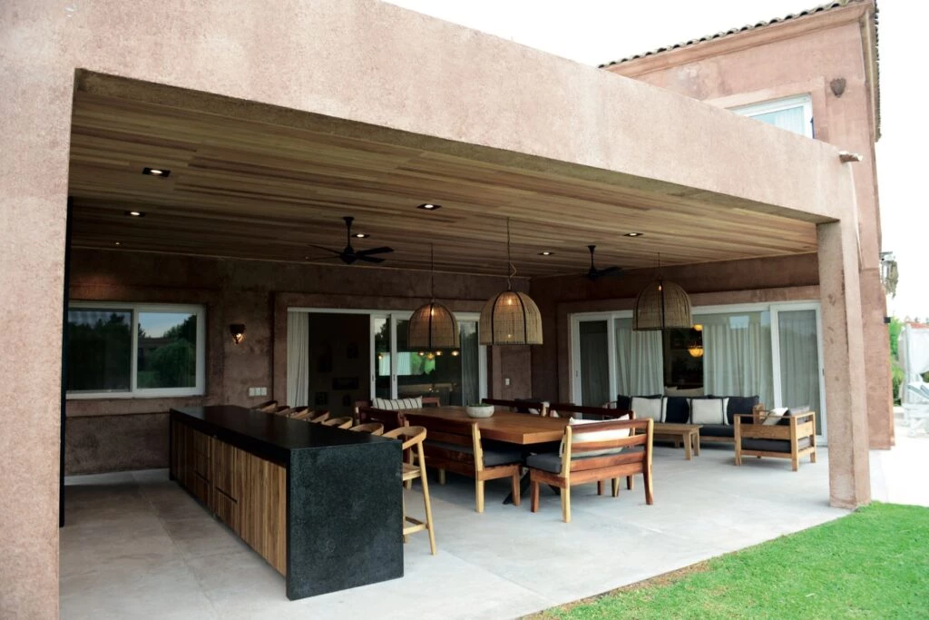 Como la galería original era muy angosta (con un diseño en “L” que hacía imposible armar puntos de encuentro) se optó por desmontar todo lo existente para empezar de cero y crear un espacio amplio y sin cortes, con la parrilla y una gran barra y mesada de apoyo a un lado, el comedor al centro y el living de exteriores en el otro extremo.