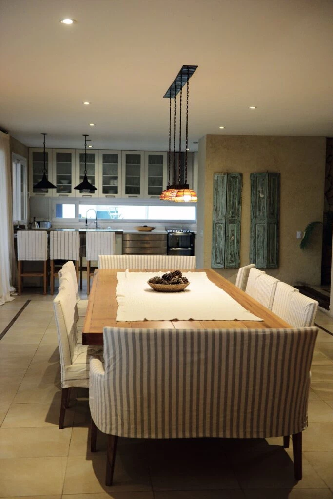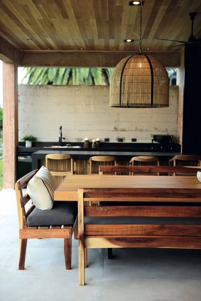 Se optó por muebles de lapacho, con una gran mesa central diseñada a medida en un mayor ancho y acompañada de bancos largos a cada lado y dobles en las cabeceras. La iluminación se resolvió con focos de luz puntual y grandes lámparas de mimbre y hierro (@gloriaatelierdeco).