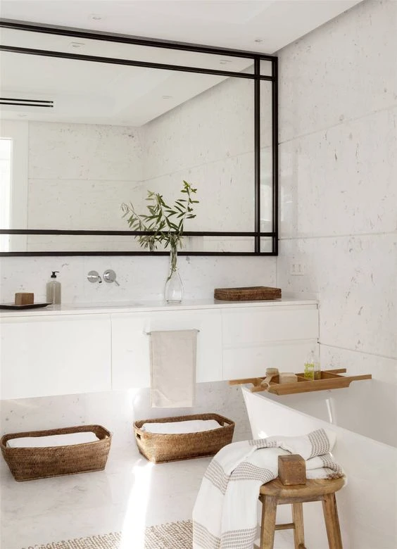 Si en cambio te tirás más por un estilo elegante, un espejo rectangular y sin marco puede ser perfecto. Este tipo de diseño es sobrio y minimalista, dejando que el resto de los elementos (como azulejos y muebles) sean los que tomen protagonismo.