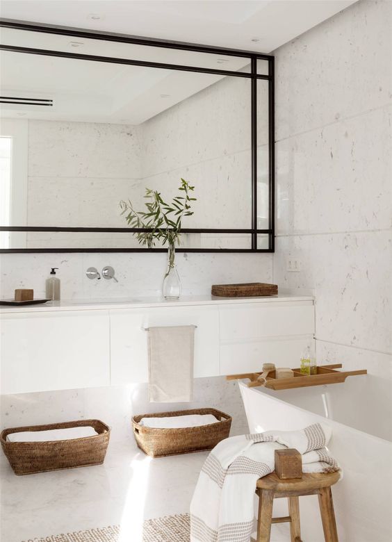 Si en cambio te tirás más por un estilo elegante, un espejo rectangular y sin marco puede ser perfecto. Este tipo de diseño es sobrio y minimalista, dejando que el resto de los elementos (como azulejos y muebles) sean los que tomen protagonismo.