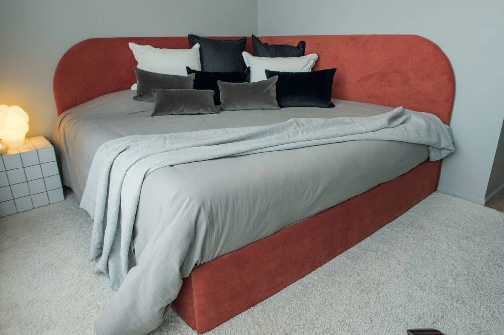 Está realizada en esquina, y tiene un respaldo en ambas paredes que permite recostarse en dos posiciones. La acompaña una mesa de luz (Estudio Quadra) y un banco de apoyo (Estudio Bull).