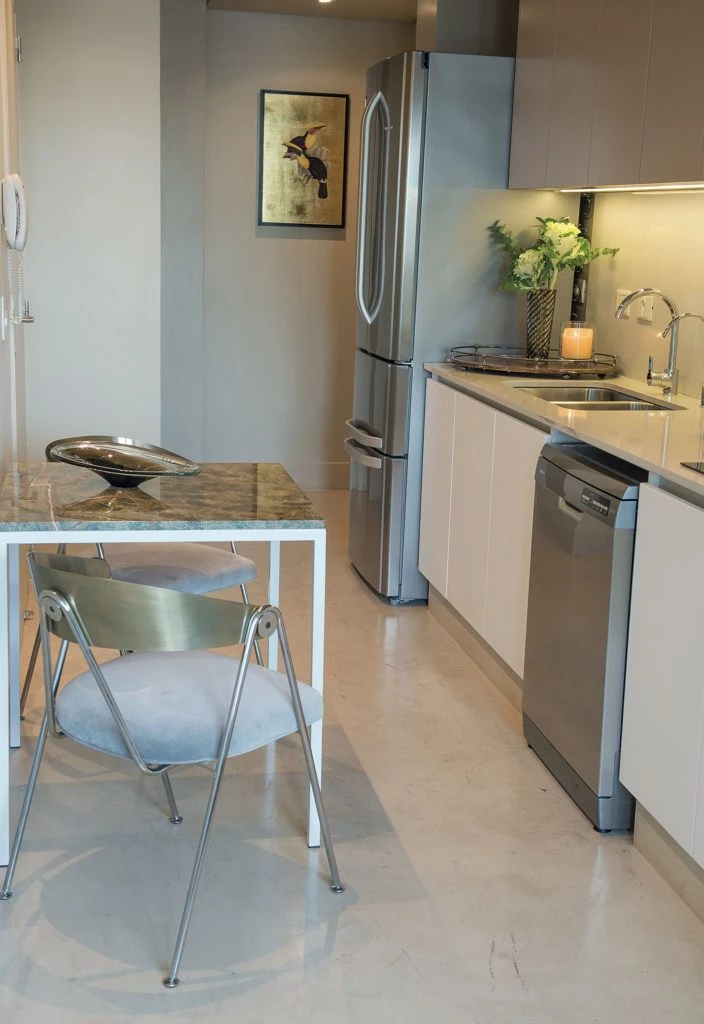 En la cocina, se mantuvieron los muebles originales y la mesada de Silestone. La nueva alacena, el piso de microcemento y la pintura generaron una envolvente que logra otro clima sin la necesidad de una reforma integral.