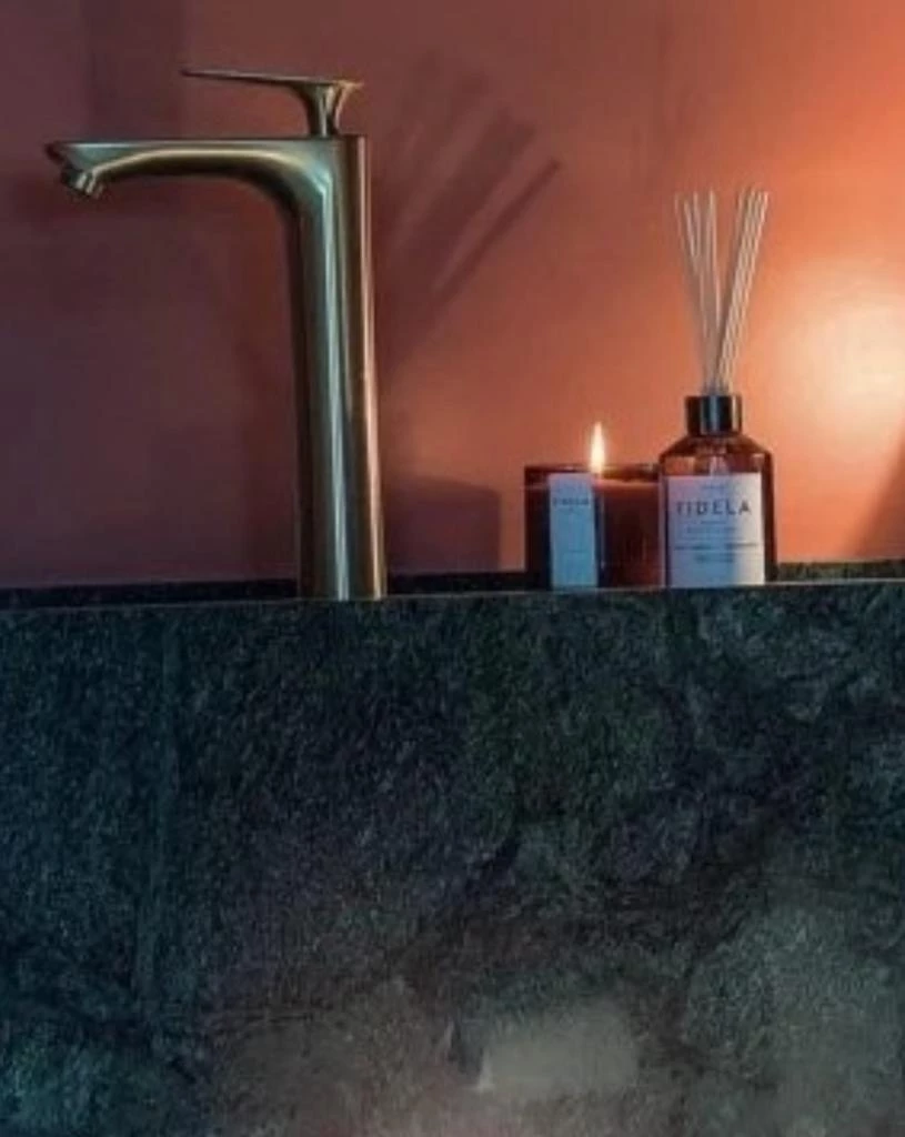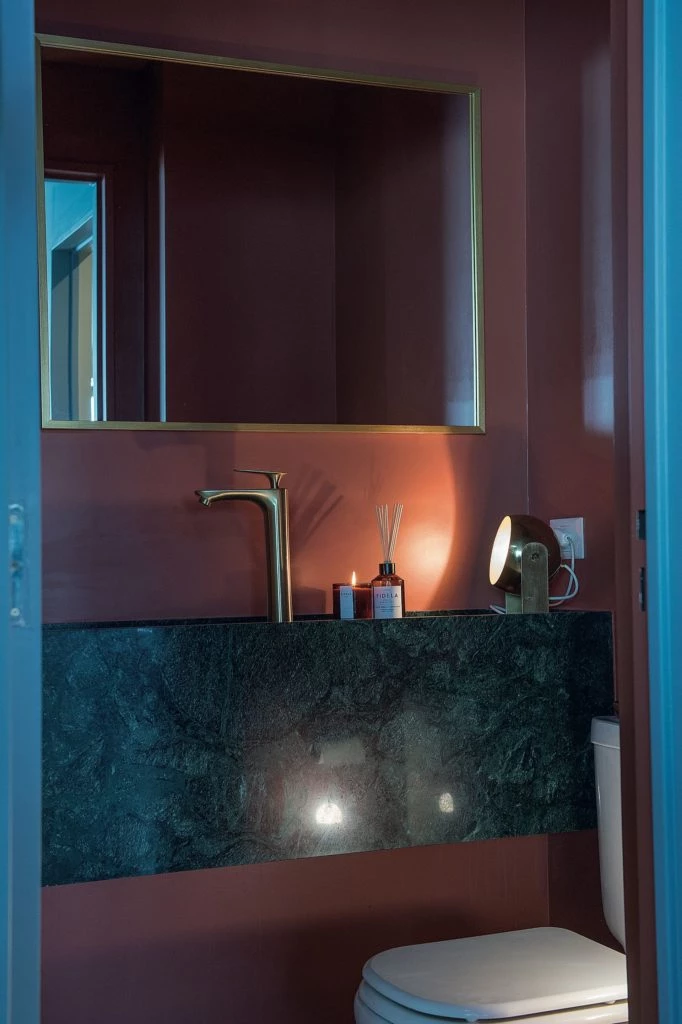 El baño fue diseñado para causar impacto, y propone una mesada en mármol verde oriental (SB Mármoles) que contrasta con la pintura de paredes y techo en colorado y los tonos bronce del único artefacto de iluminación, una lámpara de mesa hallada en el Mercado de Pulgas.