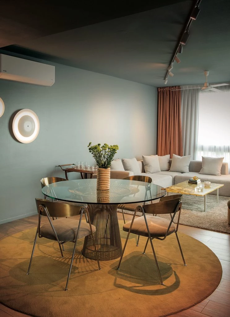 En primer plano, la icónica mesa creada por Warren Platner para Knoll en los años 60 (Anticuario Ohmio), bien acompañada por las sillas 40, de La Feliz. Se jugó con los distintos tipos de cromo (la base de la mesa, el respaldo y estructura de las sillas) y con las formas redondas que mejoran la circulación del espacio.