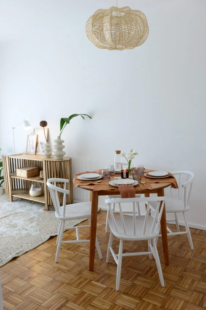 Para el comedor se eligió una mesa redonda (en espacios chicos, ayuda a que se circule mejor) con sillas estilo Windsor de respaldo bajo (todo de @jcl.sa). Sobre la mesa cae una lámpara de fibras naturales (Verde Menta Deco). Manteleria y vajilla (Belle Table y Verde Menta Deco).