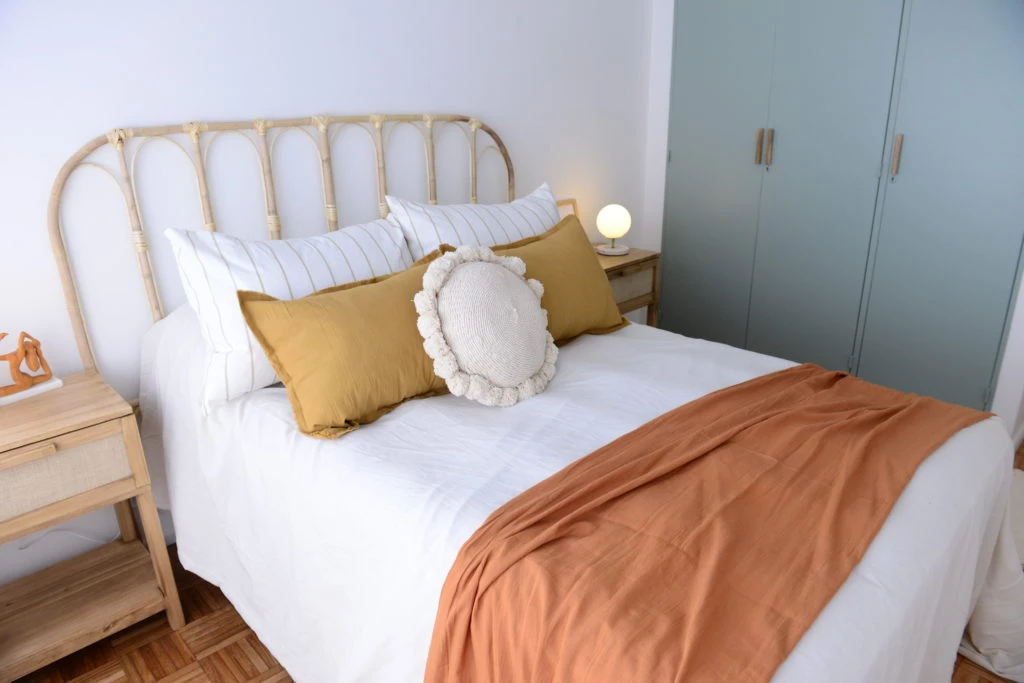 Aunque pequeño, el dormitorio principal no se priva de tener estilo propio. Su cohesión con el resto del depto se logró vistiéndolo con la calidez que aportan las fibras naturales y los géneros nobles.