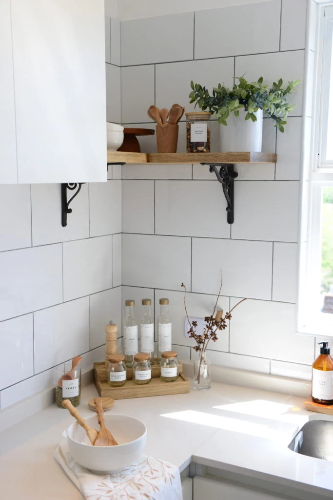 En esquina se decidió poner un estante de madera con ménsulas vintage (Verde Menta Deco). El calefón también quedo escondido por un mueble.