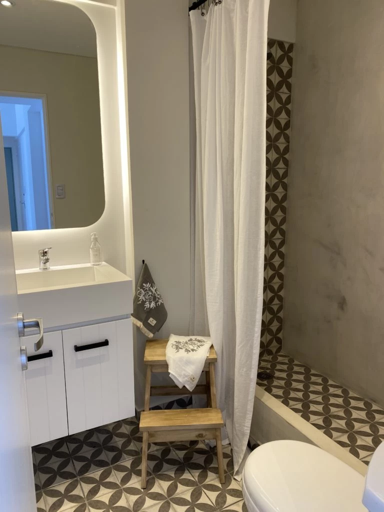 El baño fue hecho a nuevo (cañerías y electricidad) y se buscó una distribución más organizada de los sanitarios y el mueble vanitory.