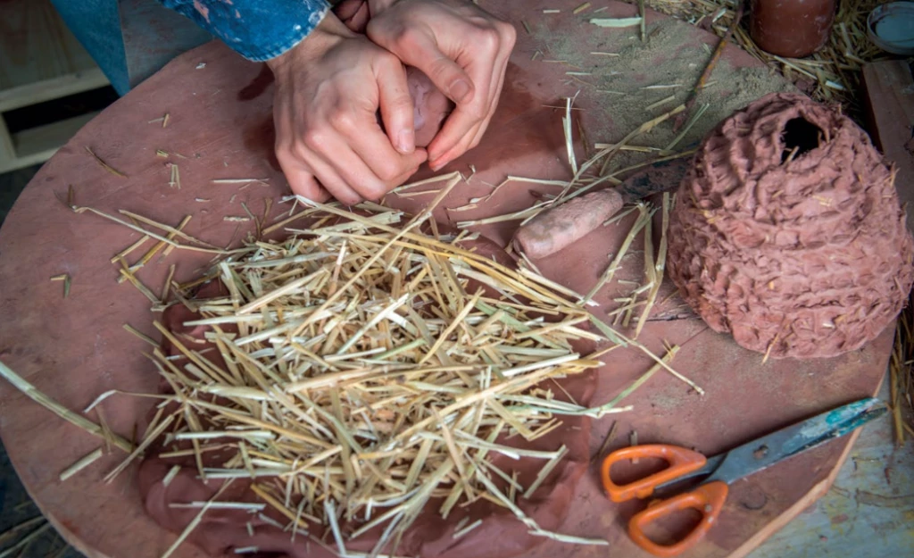 Sus creaciones están hechas de arcilla roja y se construyen colocando chorizo por chorizo para ir cociendo el barro con las manos. Luego son horneadas, generalmente en horno a leña.