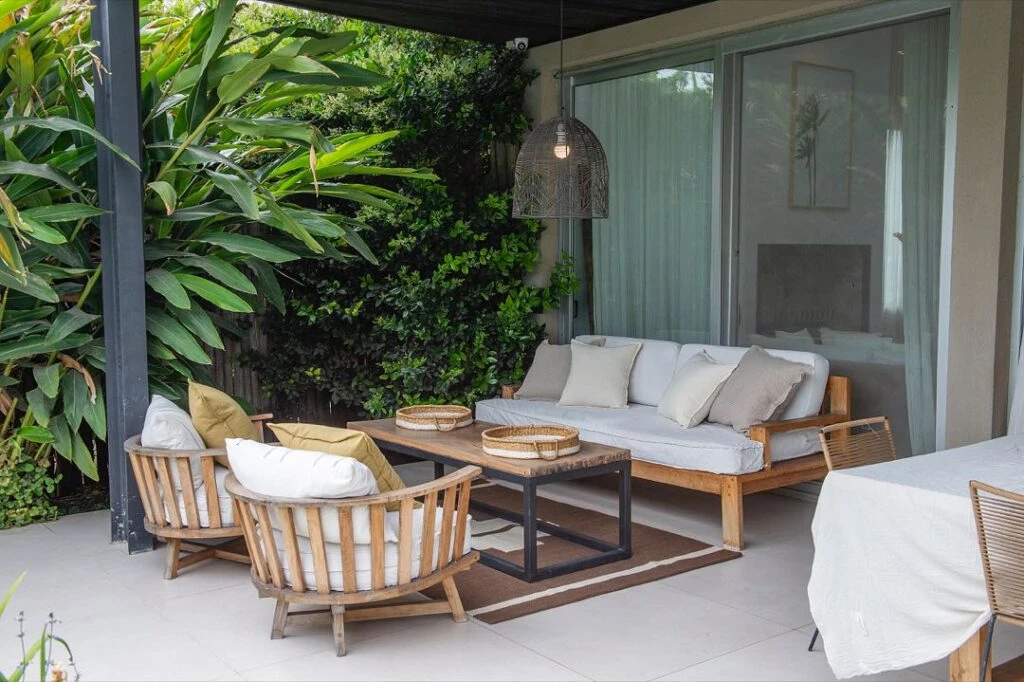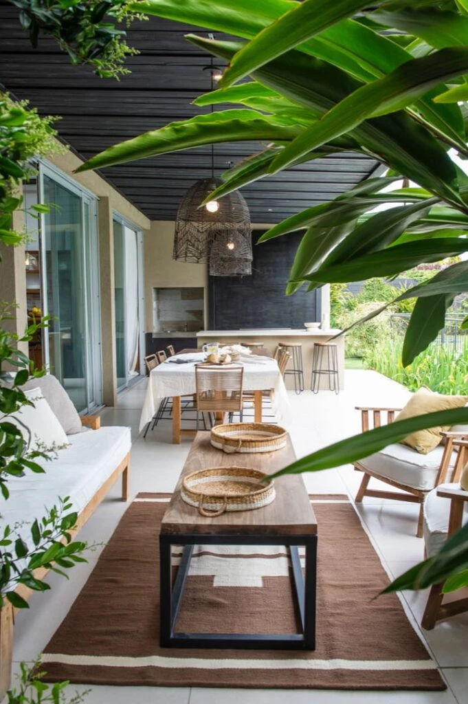 La casa se desarrolla en una sola planta, con un living comedor y cocina integrados en un gran espacio de doble altura, lo que garantiza amplitud y una mayor luminosidad. Todos los ambientes, además, tienen puertas ventanas hacia el jardín y se integran con el verde exterior.